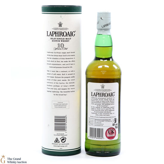 A 70cl of the medicinal 10 year old from Islay's bestselling distillery, Laphroaig. In making Laphroaig, malted barley is dried over a peat fire. The smoke from this peat, found only on Islay, gives Laphroaig its particularly rich flavour.