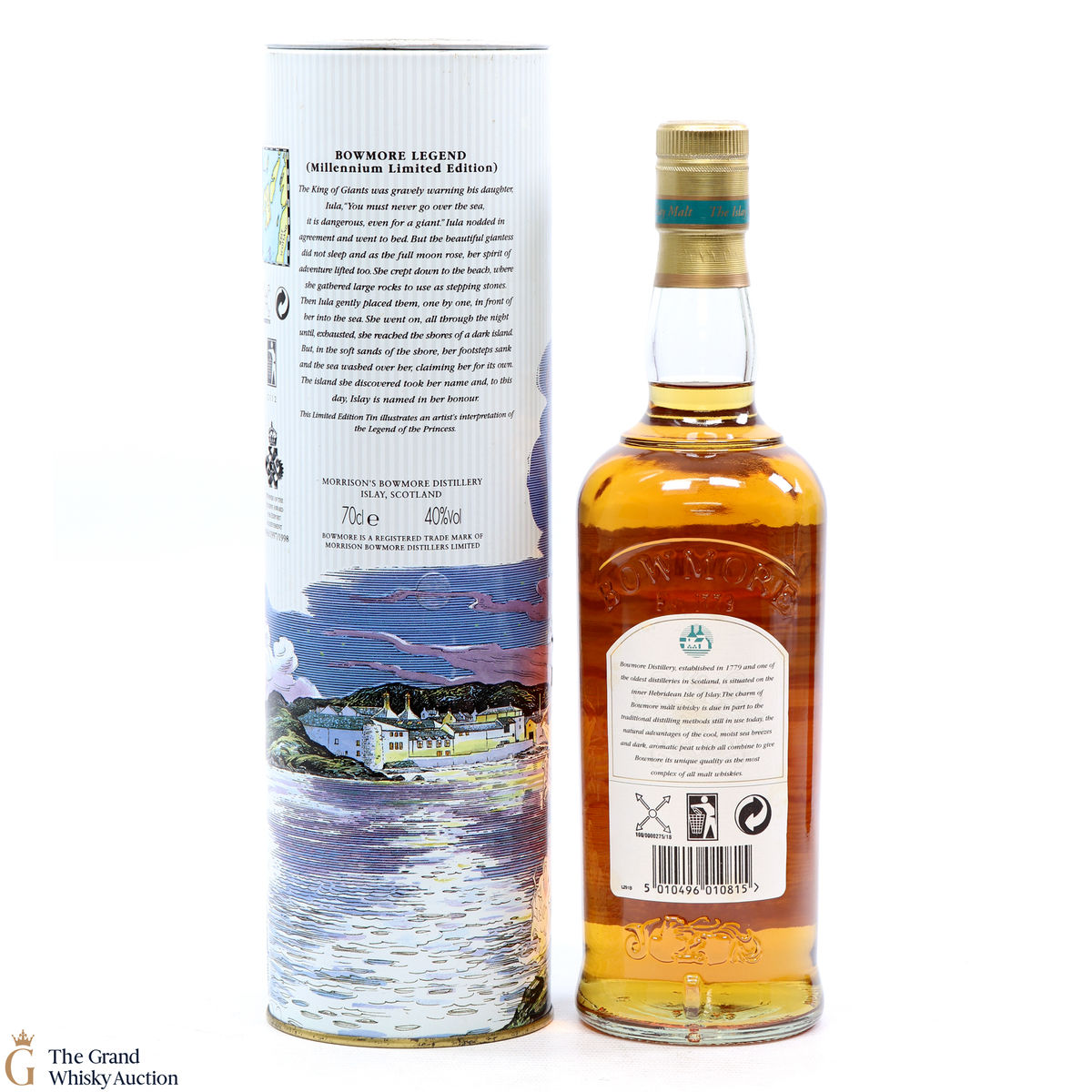The ‘Legend’ is a no-age-statement whisky that showcases Bowmore distillery’s classic peat smoke. A Bowmore Legend (Limited Edition). Created in the Bowmore Distillery one of the oldest distilleries in Scotland. Part of a distinctive series of limited edition tins, the illustration is shown on the tin depicts a legend of romance through the eyes of an artist.