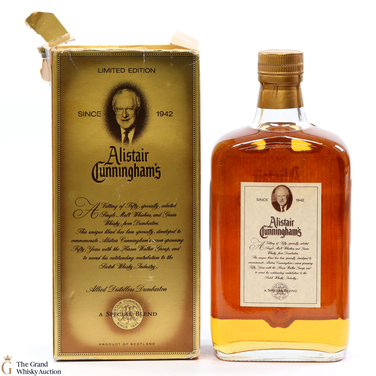Blended and bottled by Allied Distillers based in Dumbarton, this 50 year old blended whisky was a vatting of fifty specially selected single malt and grain whisky. Dedicated to Alistair Cunningham's 50 year long career.