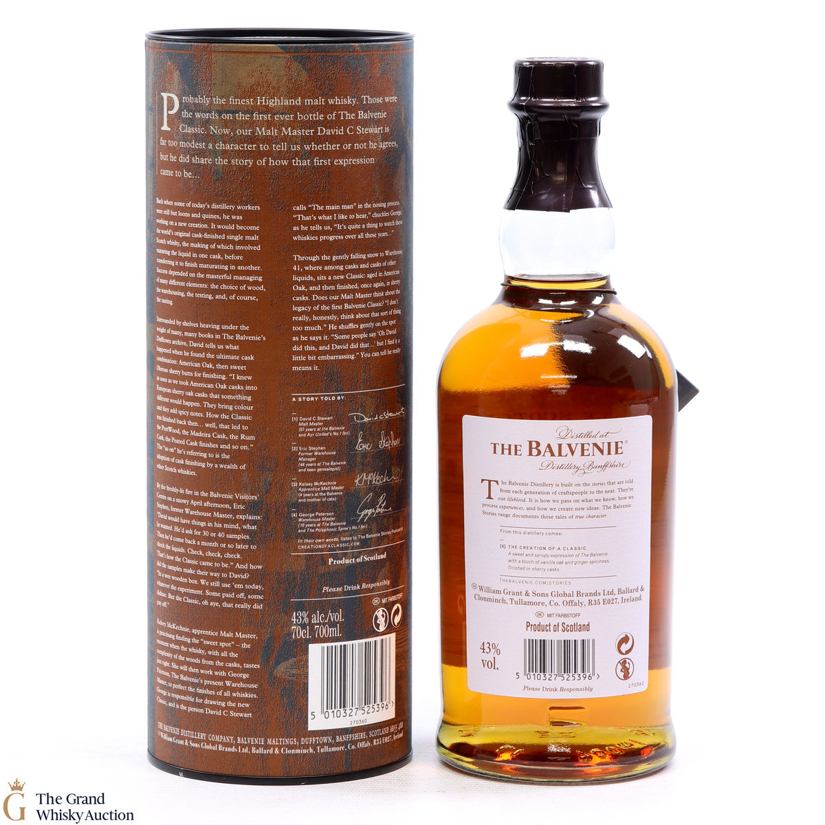 Part of a new trio of whiskies in The Balvenie Stories collection. This no-age-statement whisky pays homage to David Stewart MBE, The Balvenie malt master and longest-serving malt master in the industry. Stewart created the first cask-finished whisky back in the 1980s with The Balvenie Classic. The Creation of the Classic has been matured in American oak casks and finished in oloroso Sherry casks.