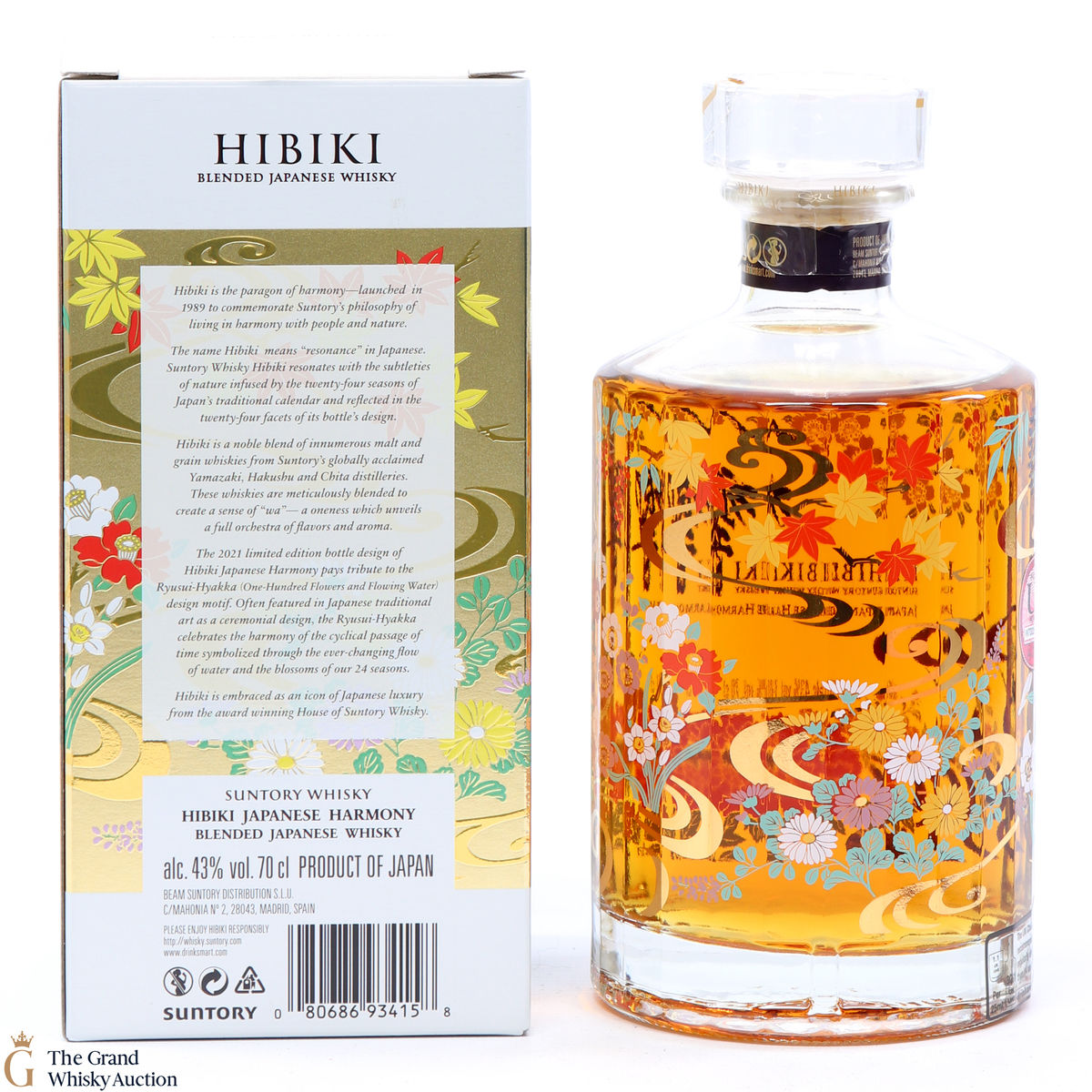This is a limited edition, specially designed bottle with painted flowers and flowing ribbons of water. The 2021 special edition pays homage to the Ryisui-Hyakka (One Hundred Flowers and Flowing Water) and celebrates different seasonal flowers which help characterise the Japanese seasons. 5 types of casks were used and in typical Hibiki fashion, the bottle always has 24 facets which represent 24 seasons in the Japanese lunar calendar.