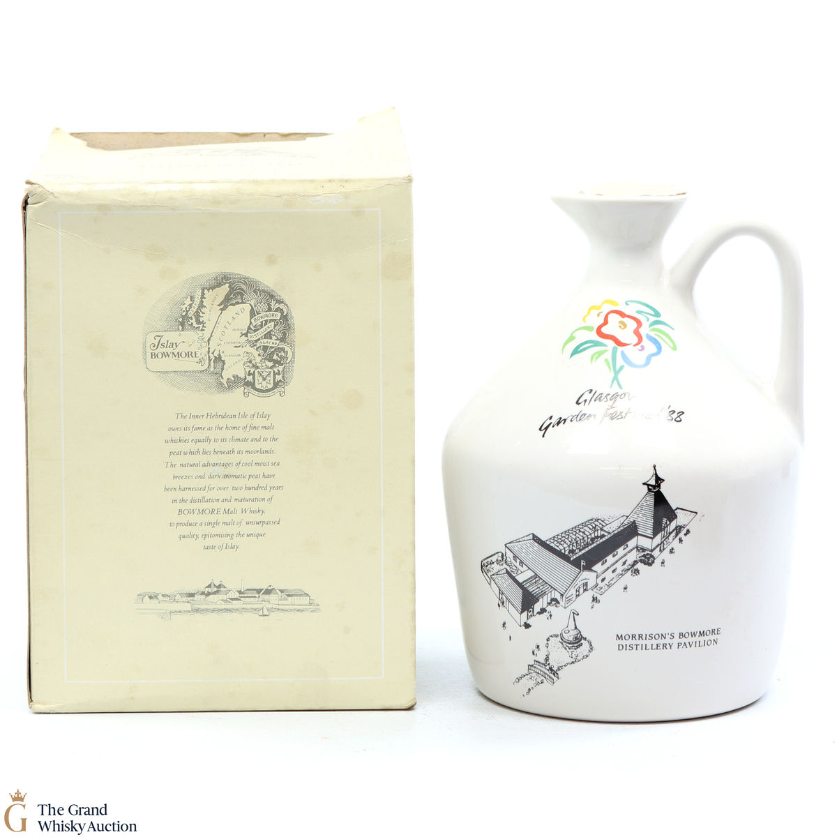 A rare ceramic Bowmore released for Glasgow Garden Festival in 1988, with Bowmore 15-year-old inside, which has hints of white chocolate, exotic fruits and pepper.