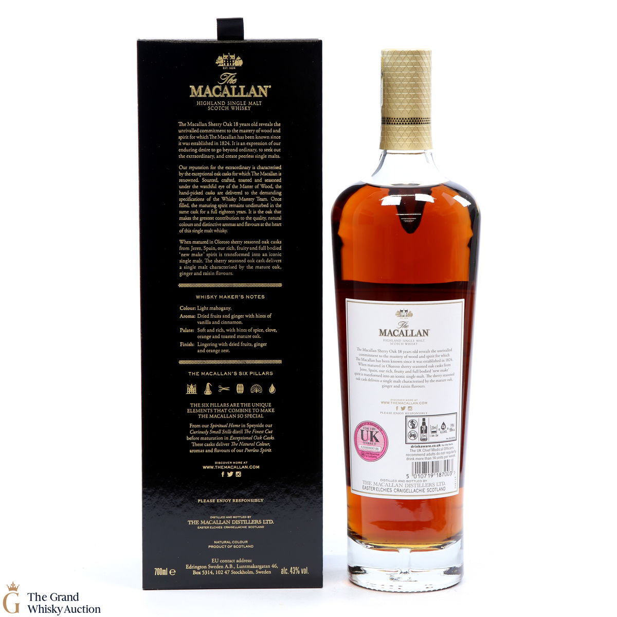 This annual release of The Macallan's popular 18 Year Old Sherry Oak is matured exclusively in sherry seasoned casks, built from both Spanish and American oak, providing a beautifully dark flavour with rich aromas.