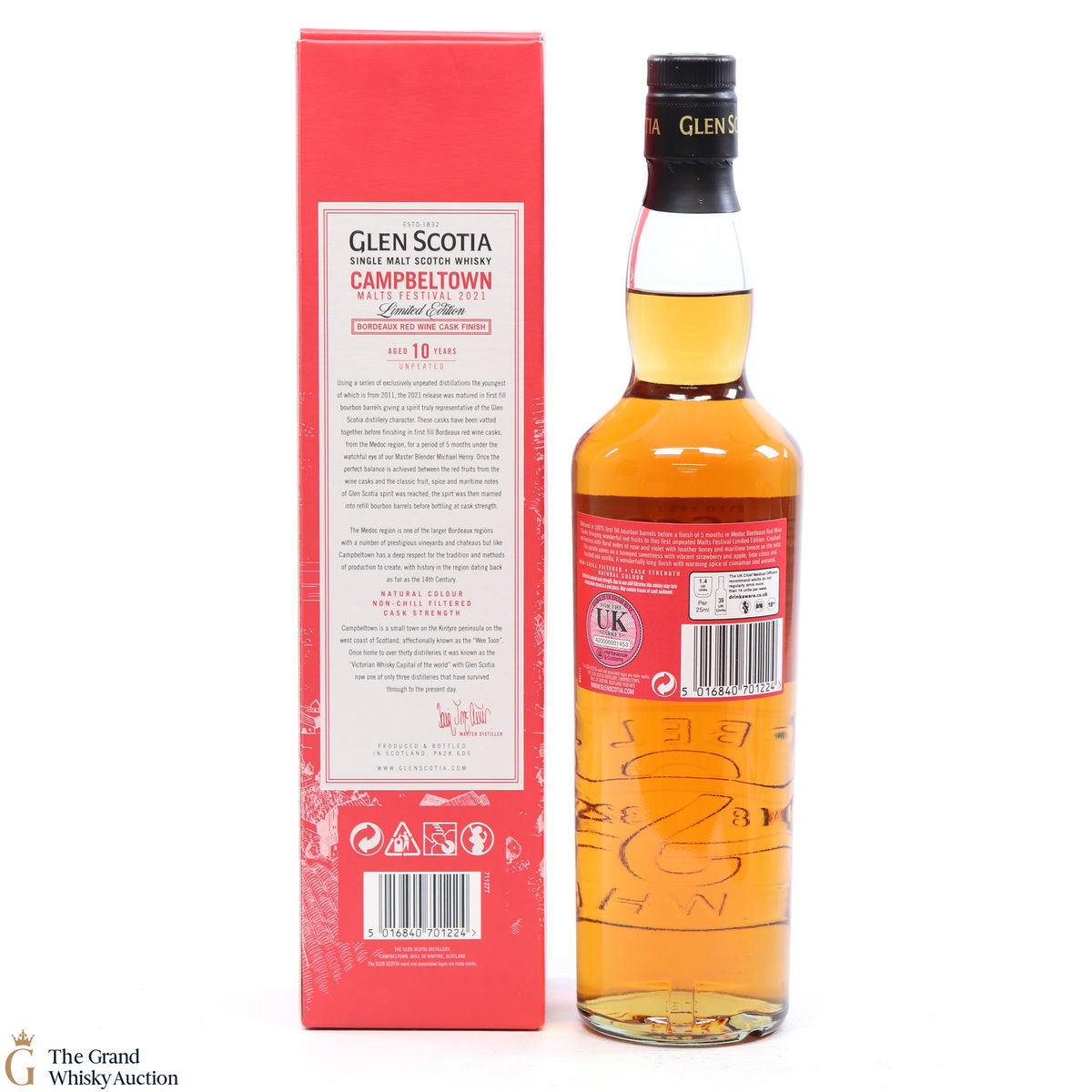Distilled at Glen Scotia distillery, this limited edition malt was matured in 100% first fill bourbon barrels before being finished in Bourdeaux red wine casks. This bottling was specifically for the Campbeltown Malt Festival 2021 and is the first unpeated release.