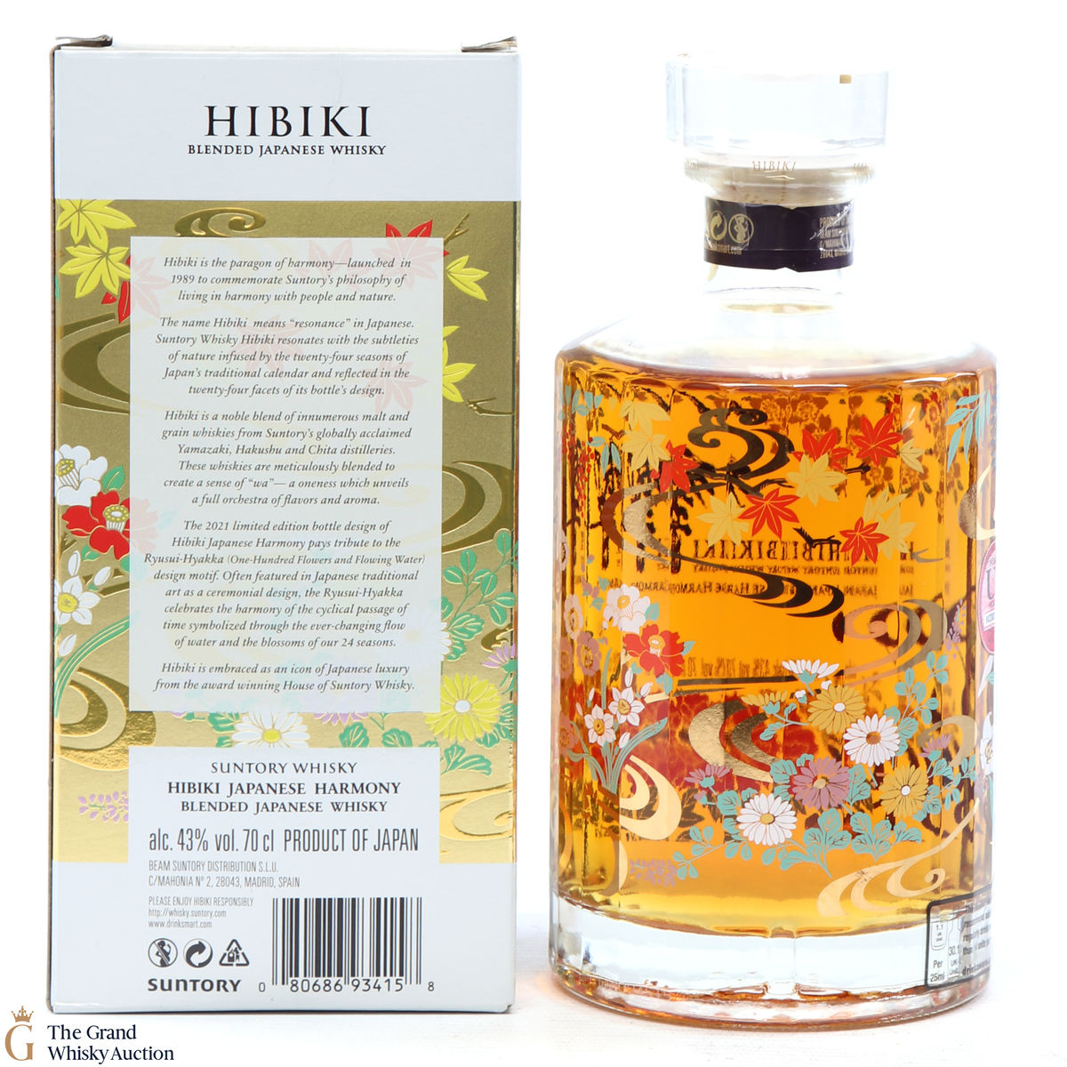 This is a limited edition, specially designed bottle with painted flowers and flowing ribbons of water. The 2021 special edition pays homage to the Ryisui-Hyakka (One Hundred Flowers and Flowing Water) and celebrates different seasonal flowers which help characterise the Japanese seasons. 5 types of casks were used and in typical Hibiki fashion, the bottle always has 24 facets which represent 24 seasons in the Japanese lunar calendar.