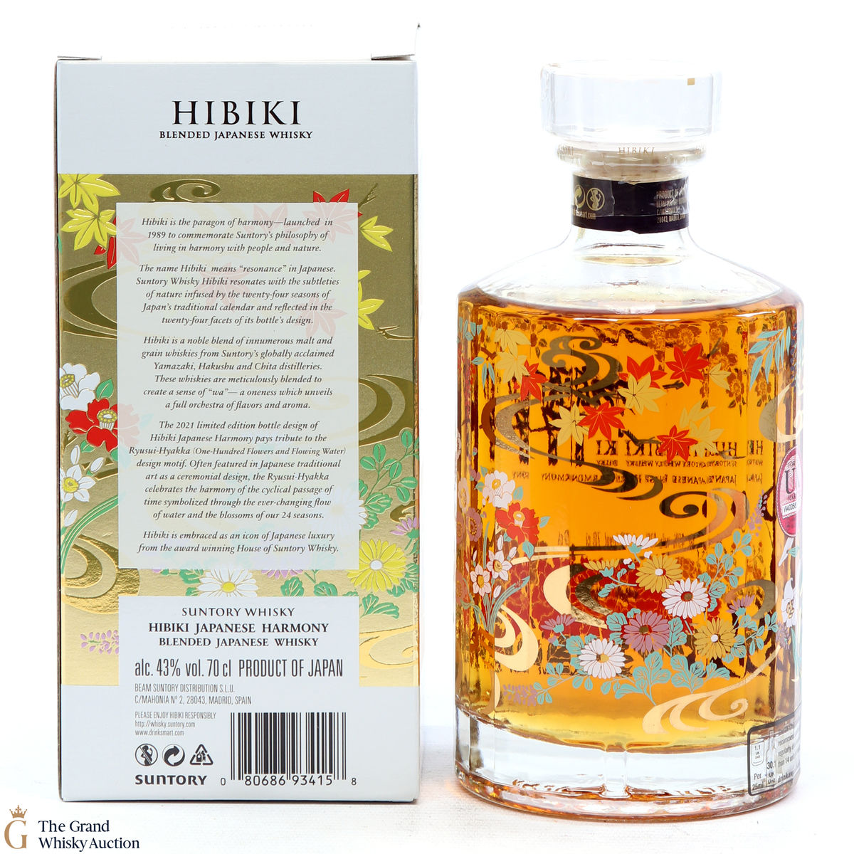 This is a limited edition, specially designed bottle with painted flowers and flowing ribbons of water. The 2021 special edition pays homage to the Ryisui-Hyakka (One Hundred Flowers and Flowing Water) and celebrates different seasonal flowers which help characterise the Japanese seasons. 5 types of casks were used and in typical Hibiki fashion, the bottle always has 24 facets which represent 24 seasons in the Japanese lunar calendar.