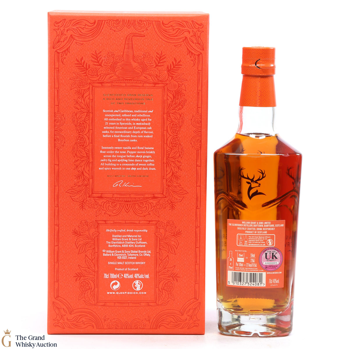 The Glenfiddich Gran Reserva has matured and mellowed in American Oak Casks for 21 years before been finished in previously used Caribbean Rum casks for 4 months.