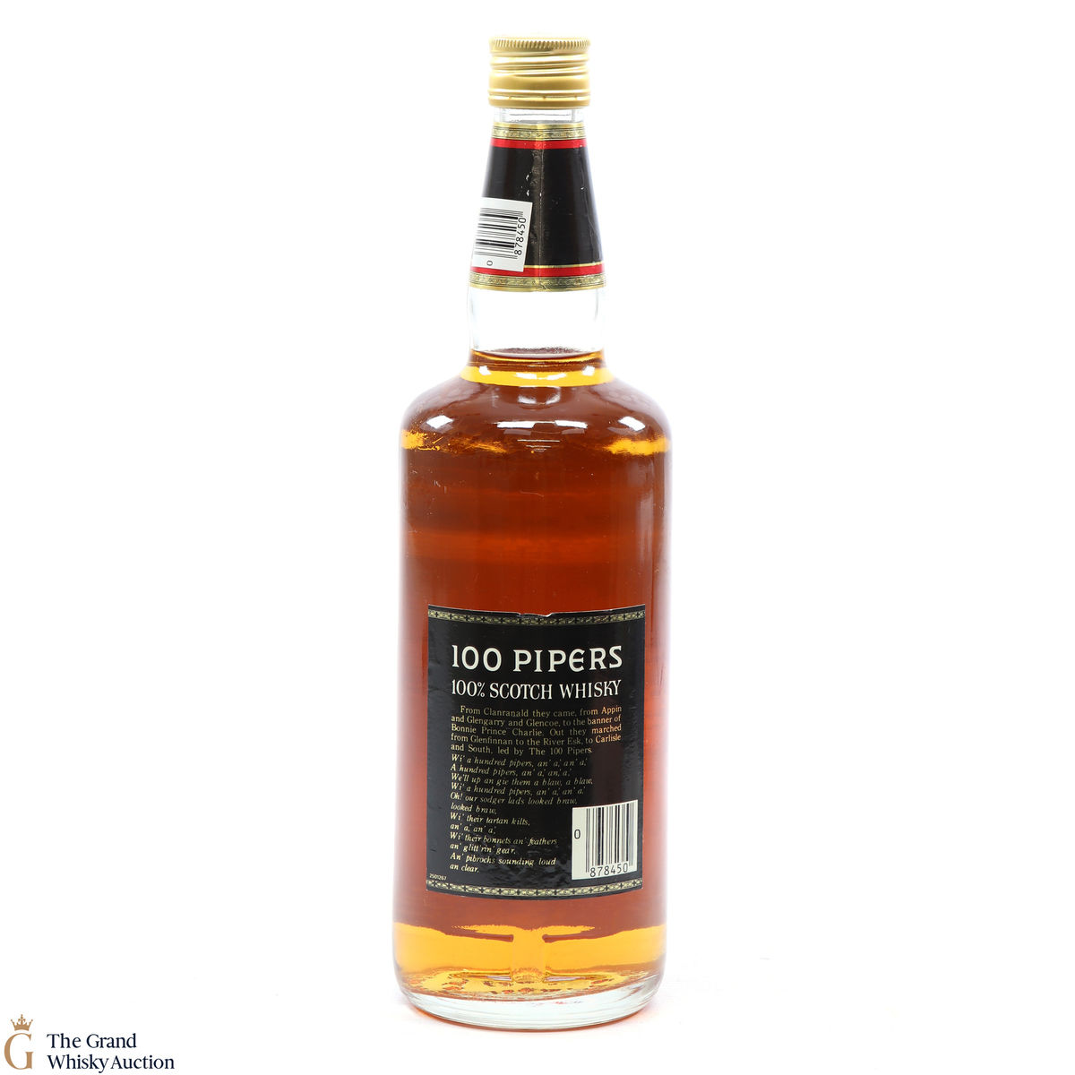 A 75cl bottling of Seagram's 100 Pipers Deluxe blended Scotch whisky, which was named after the 100 pipers that followed Bonnie Prince Charlie into battle.
