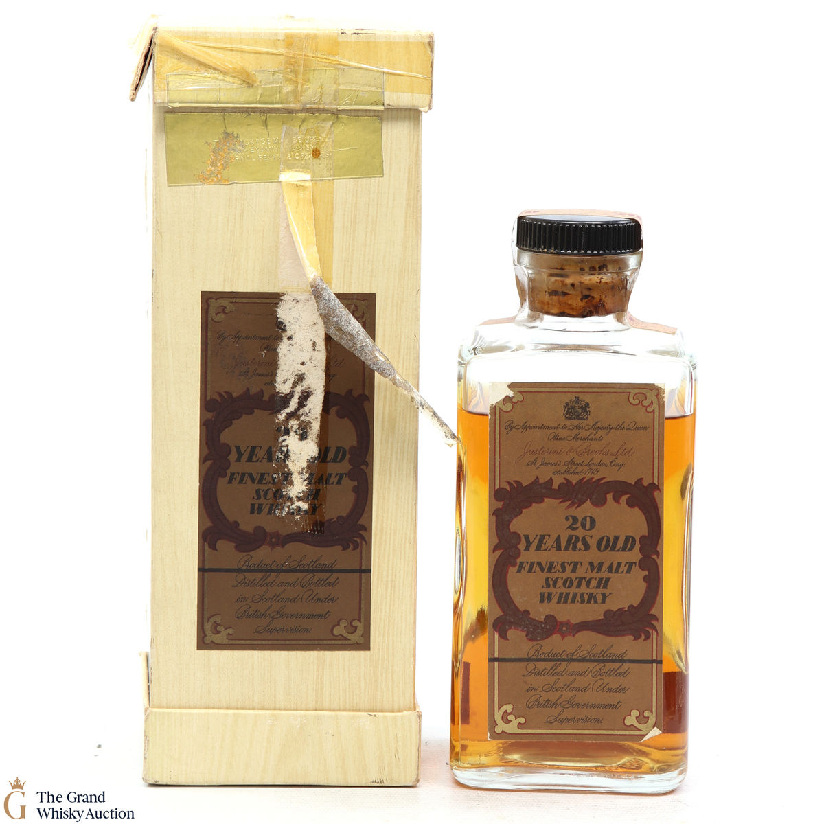 A rather antique bottle of 20-year-old whisky bottled by Justerini & Brooks, estimated to be dated from around the 1960s or 1970s.