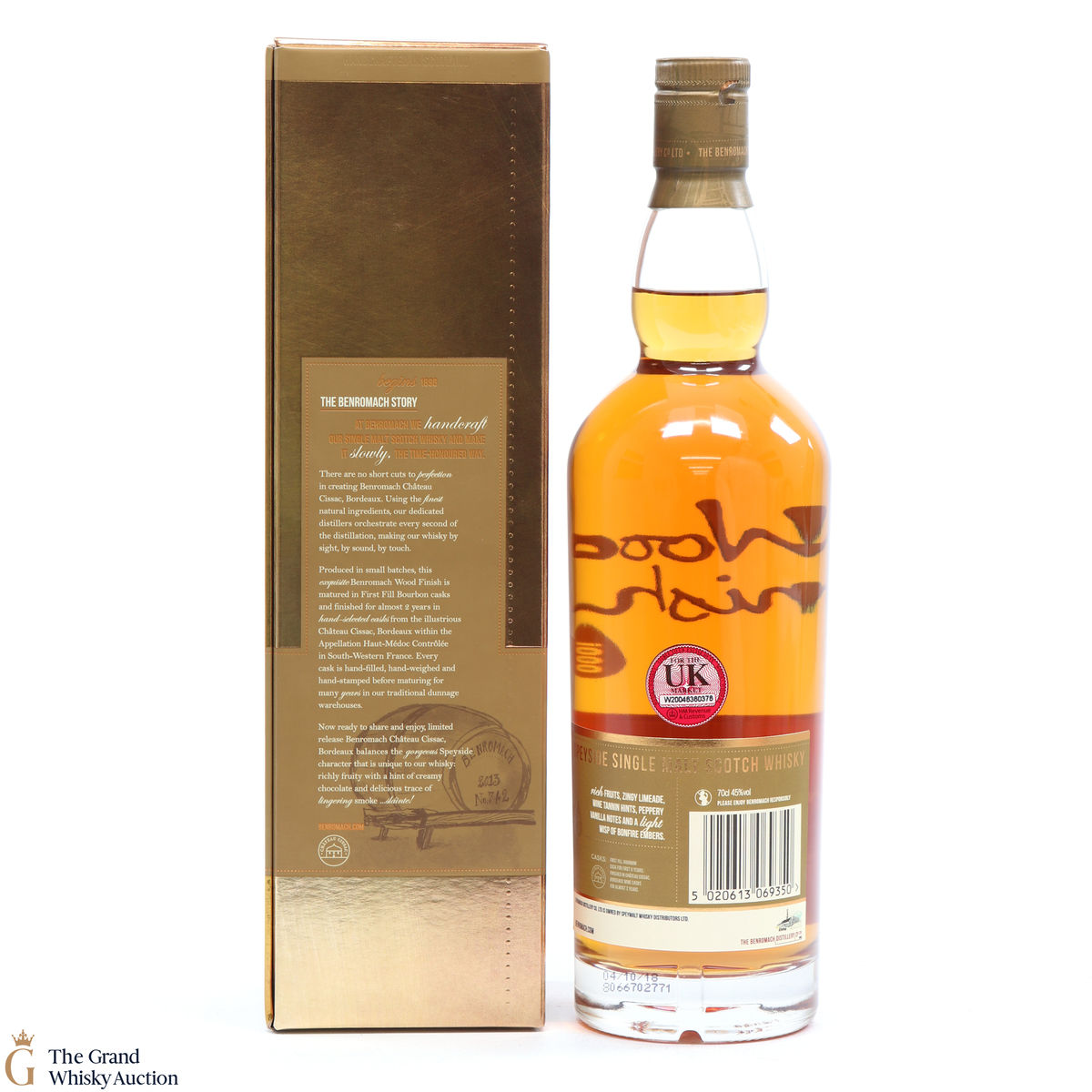A 2010 vintage Benromach, released as part of Benromach's Wood Finish series. This single malt has been aged in first-fill bourbon then finished in Chateau Cissac wine casks from the Haut-Médoc region of Bordeaux. Bottled in 2018.