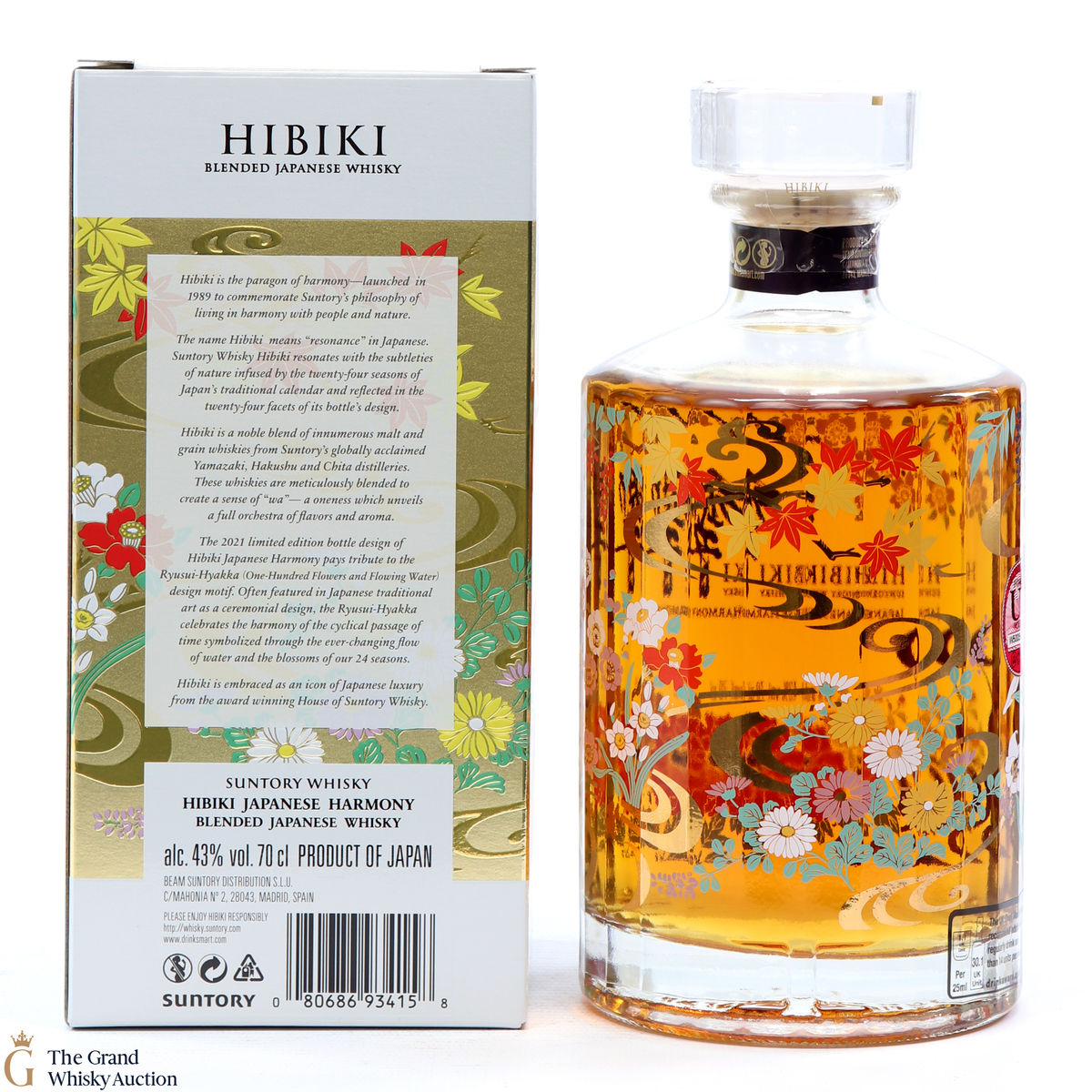 This is a limited edition, specially designed bottle with painted flowers and flowing ribbons of water. The 2021 special edition pays homage to the Ryisui-Hyakka (One Hundred Flowers and Flowing Water) and celebrates different seasonal flowers which help characterise the Japanese seasons. 5 types of casks were used and in typical Hibiki fashion, the bottle always has 24 facets which represent 24 seasons in the Japanese lunar calendar.