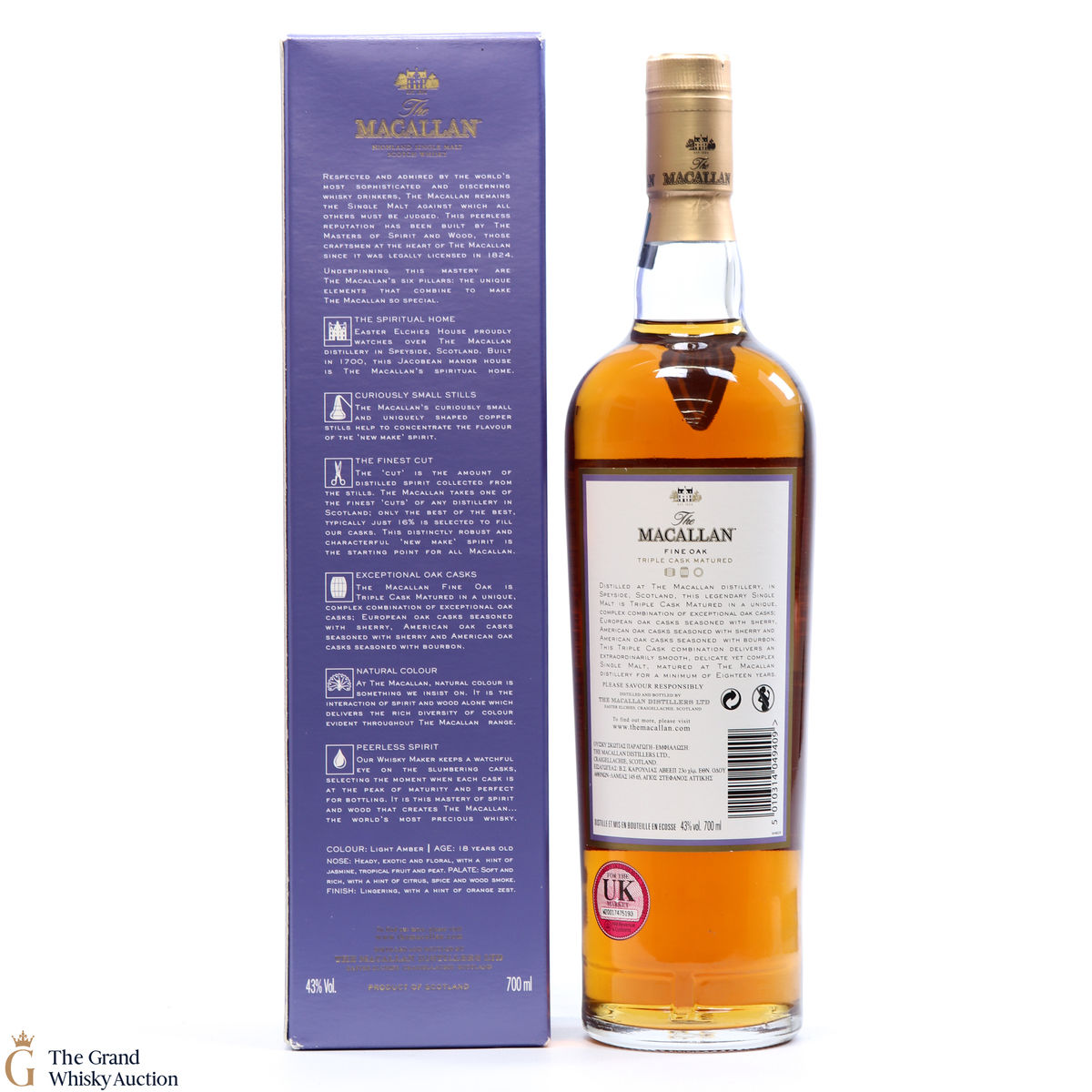 An 18 year old single malt, part of Macallan's Fine Oak range. It has been matured for eighteen years in three oak cask types; Europen oak seasoned with sherry, American oak seasoned with sherry and American oak seasoned with bourbon. This complex combination of casks has created a light amber single malt with tropical flavours balanced with wood smoke.