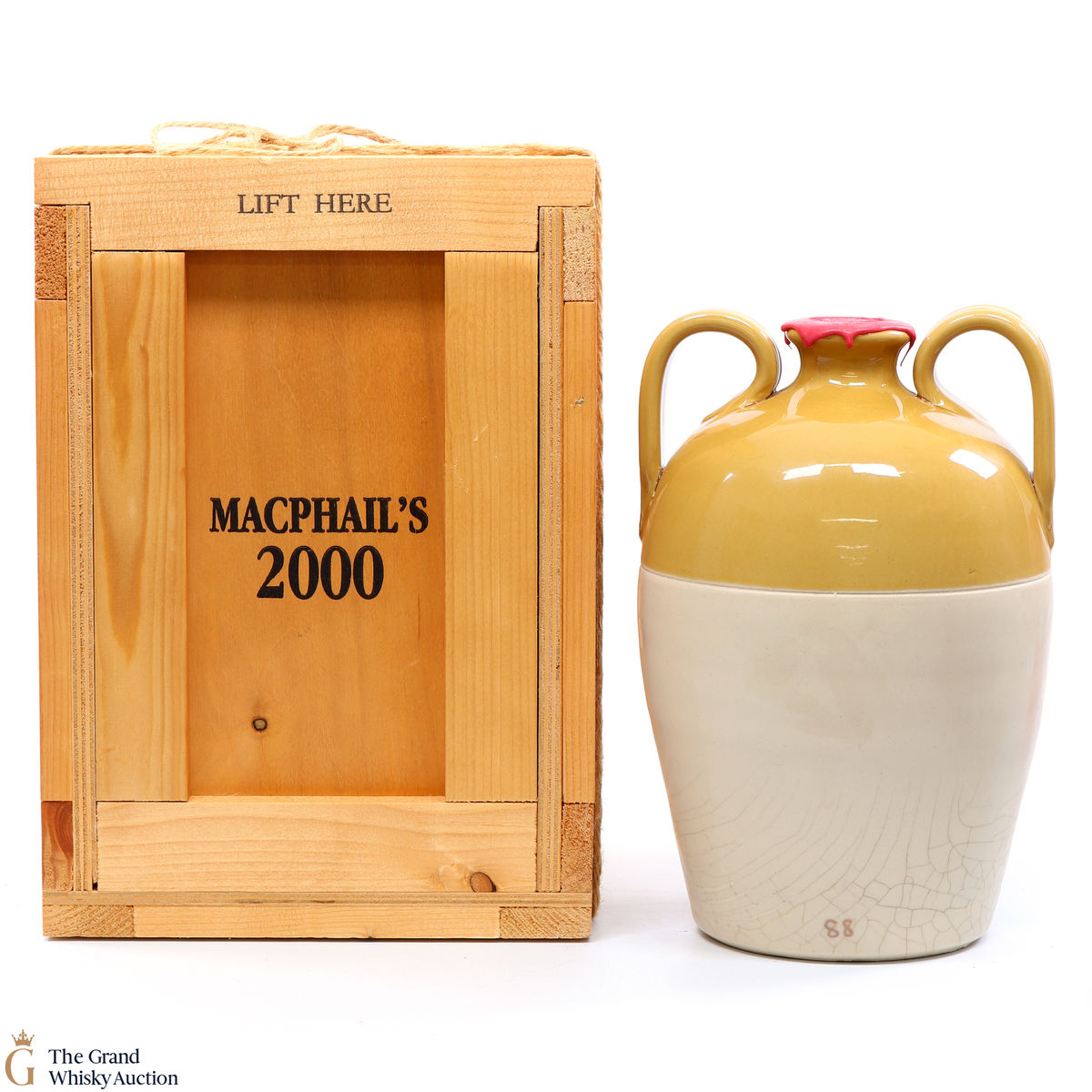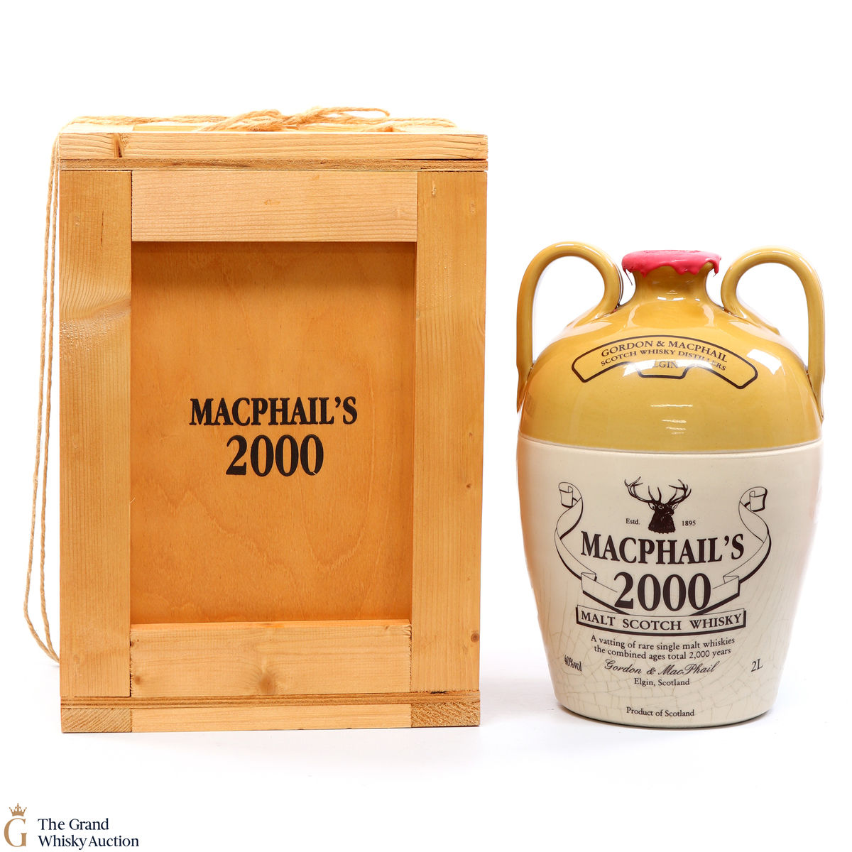 A 2-litre decanter from Gordon & Macphail containing a special vatting of malt whiskies with the combined ages totalling 2000 years. This stoneware decanter was released for the millennium in 2000.