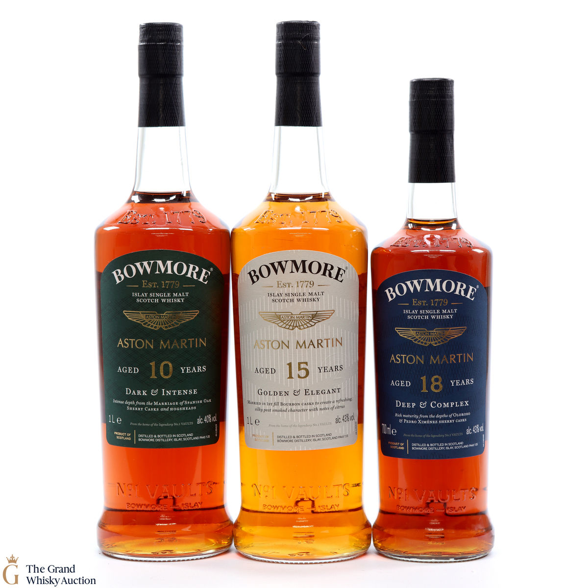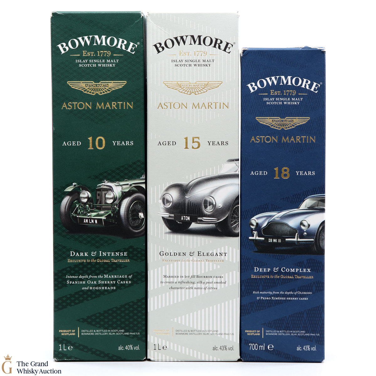 The full collection of the collaboration between Bowmore and Aston Martin, both creating timeless beauty and a lasting legacy. Each edition of the Aston Martin collection features a different car. Included in this lot is edition 1, 2 and 3: