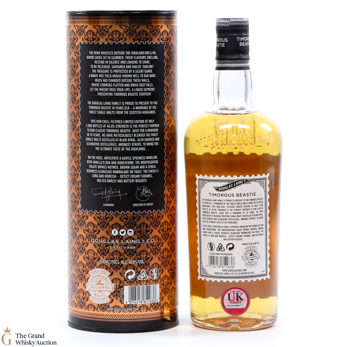 The Timorous Beastie 18-year-old is a Highland blended malt Scotch whisky that has been bottled at 46.8% ABV.