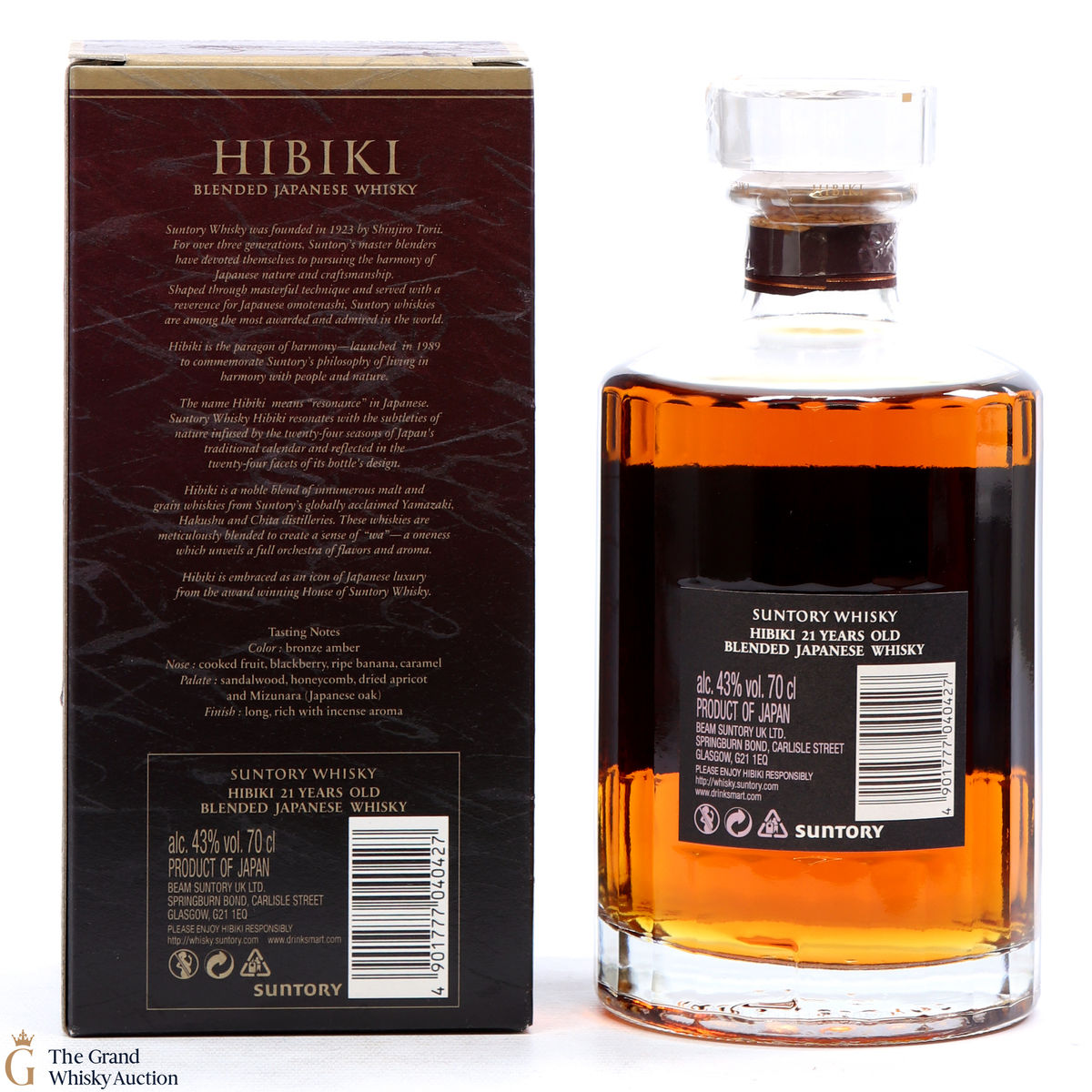 Hibiki 21 Year Old is a very popular blended whisky from Suntory. It is made up of a blend of specially selected mature malt and grain whiskies aged over 21 years. The key Yamazaki sherry casked malt is vatted with other carefully chosen mellow unblended grain whiskies over 21 years old.