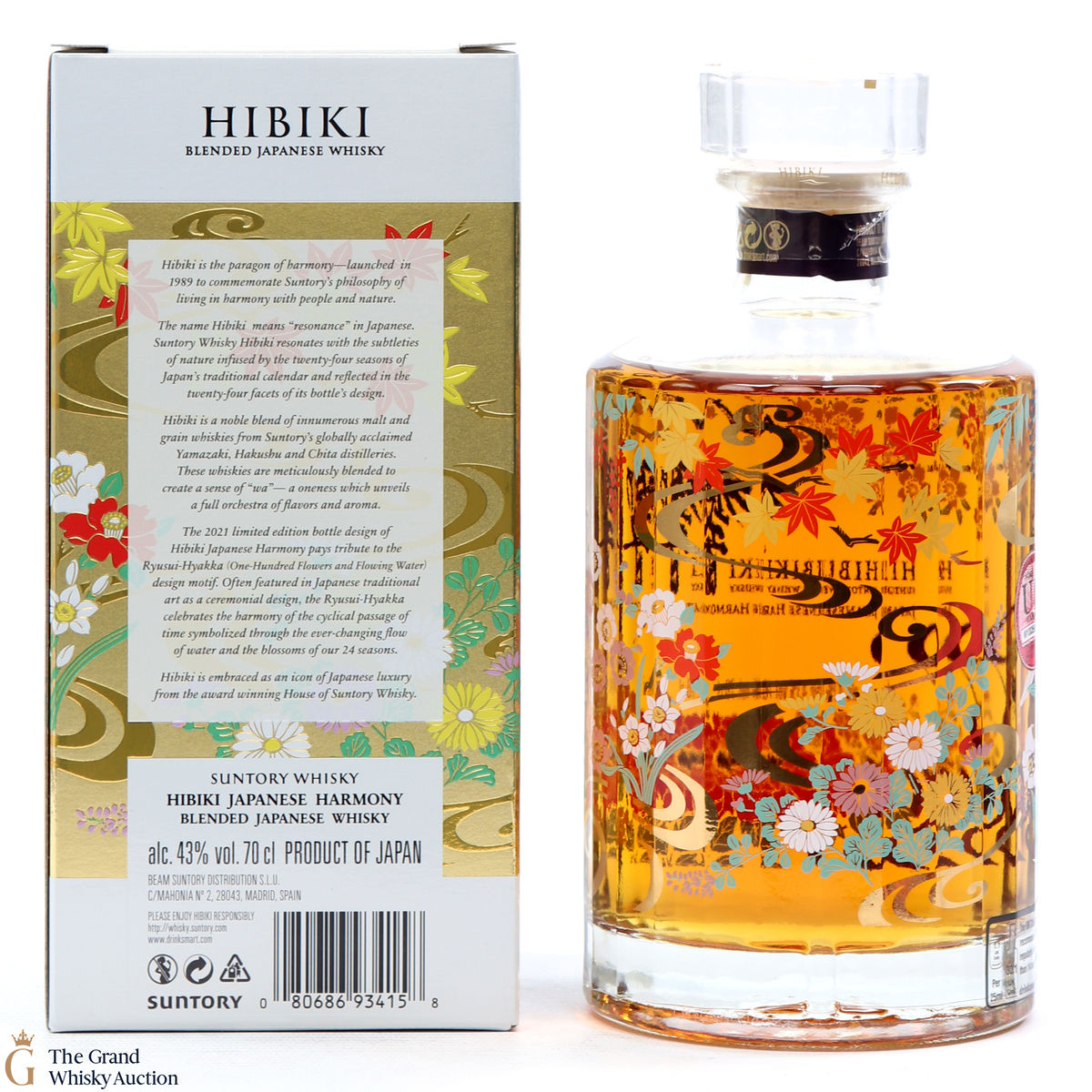 This is a limited edition, specially designed bottle with painted flowers and flowing ribbons of water. The 2021 special edition pays homage to the Ryisui-Hyakka (One Hundred Flowers and Flowing Water) and celebrates different seasonal flowers which help characterise the Japanese seasons. 5 types of casks were used and in typical Hibiki fashion, the bottle always has 24 facets which represent 24 seasons in the Japanese lunar calendar.