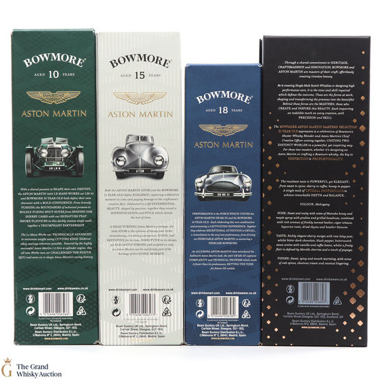 The full collection of the collaboration between Bowmore and Aston Martin, both creating timeless beauty and a lasting legacy. Each edition of the Aston Martin collection features a different car. Included in this lot is edition 1, 2, 3 & 21 YO: