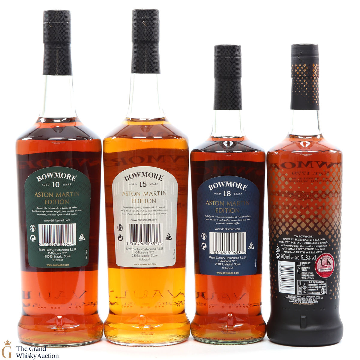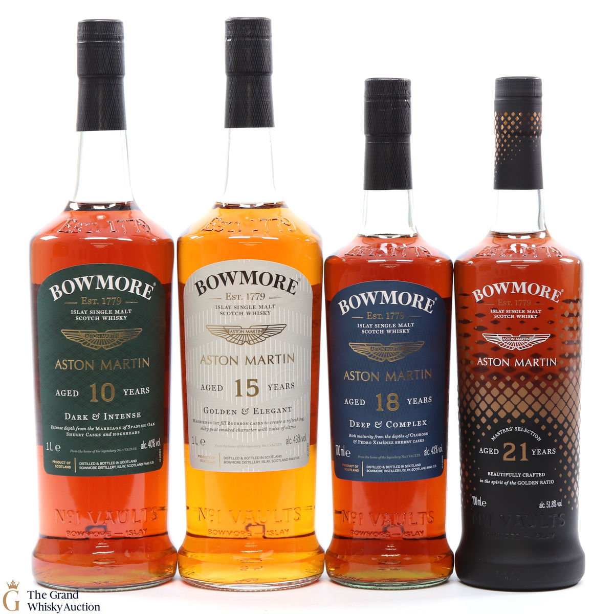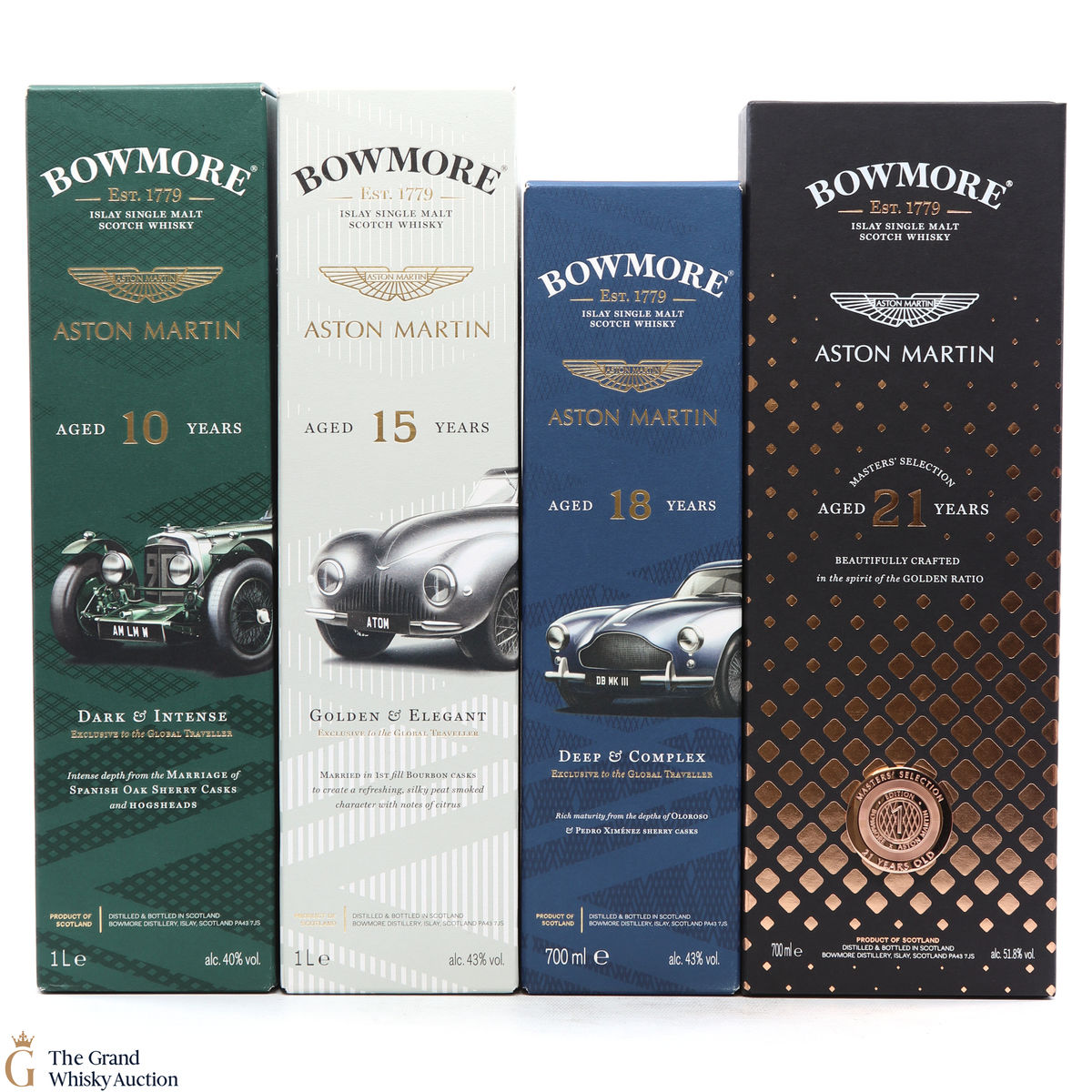 The full collection of the collaboration between Bowmore and Aston Martin, both creating timeless beauty and a lasting legacy. Each edition of the Aston Martin collection features a different car. Included in this lot is edition 1, 2, 3 & 21 YO: