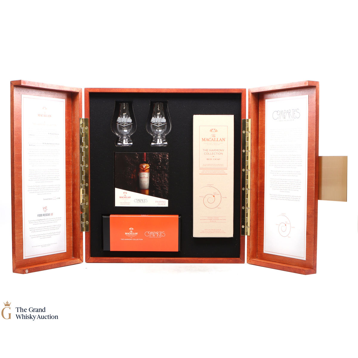 The pairing kit includes 1 x 70cl bottle of The Macallan Harmony Collection Rich Cacao, a 10-piece box of custom-made Compartés Chocolate inspired by the tasting notes of the whisky, a pairing guide and two Macallan Glencairn glasses.
