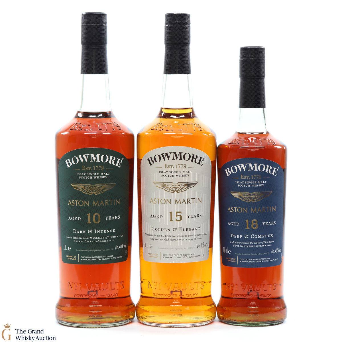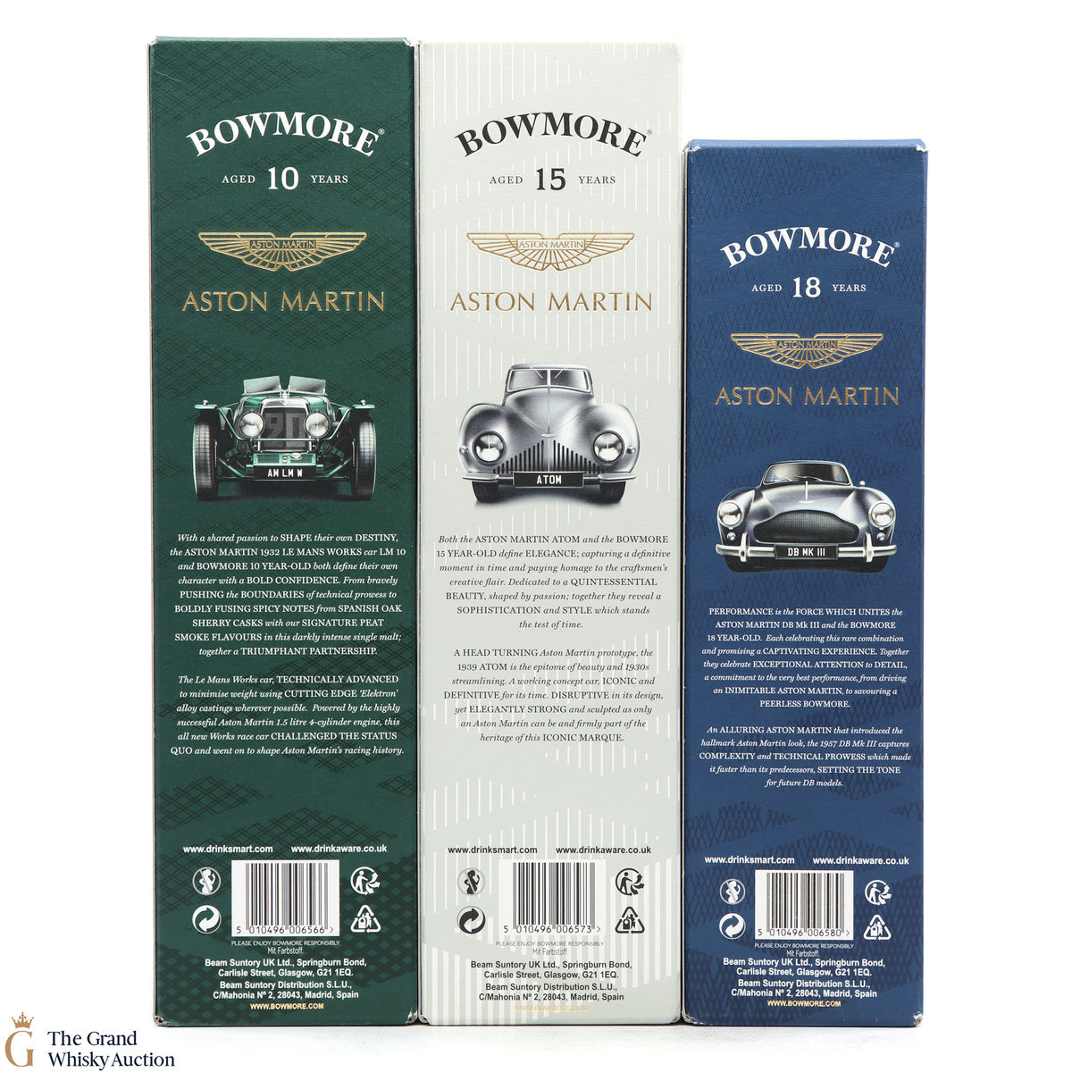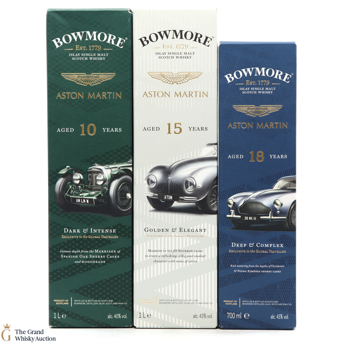 The full collection of the collaboration between Bowmore and Aston Martin, both creating timeless beauty and a lasting legacy. Each edition of the Aston Martin collection features a different car. Included in this lot is edition 1, 2 and 3: