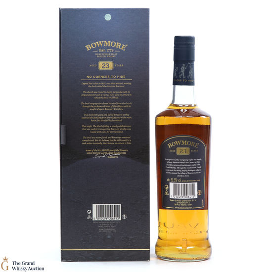 The limited release Bowmore No Corners to Hide 23 Year Old was matured for 21 years in ex-bourbon American oak hogsheads and finished for two years in Essencia barriques. Bottled at 51.5% ABV.