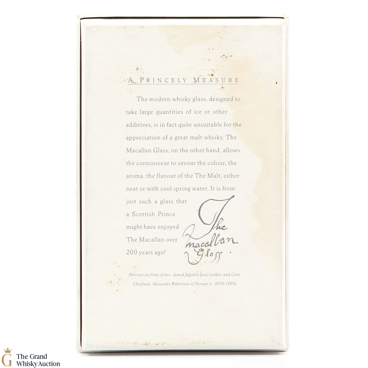Due to the various ages of bottles and their seals, the condition of liquid is at the buyer's discretion and no claim can be lodged against failure/leakage in transit. Loss and breakage cover is available at 3% of the hammer price as standard. If the lot is not insured, no claim can be lodged against the courier or The Grand Whisky Auction for breakage or loss in transit.