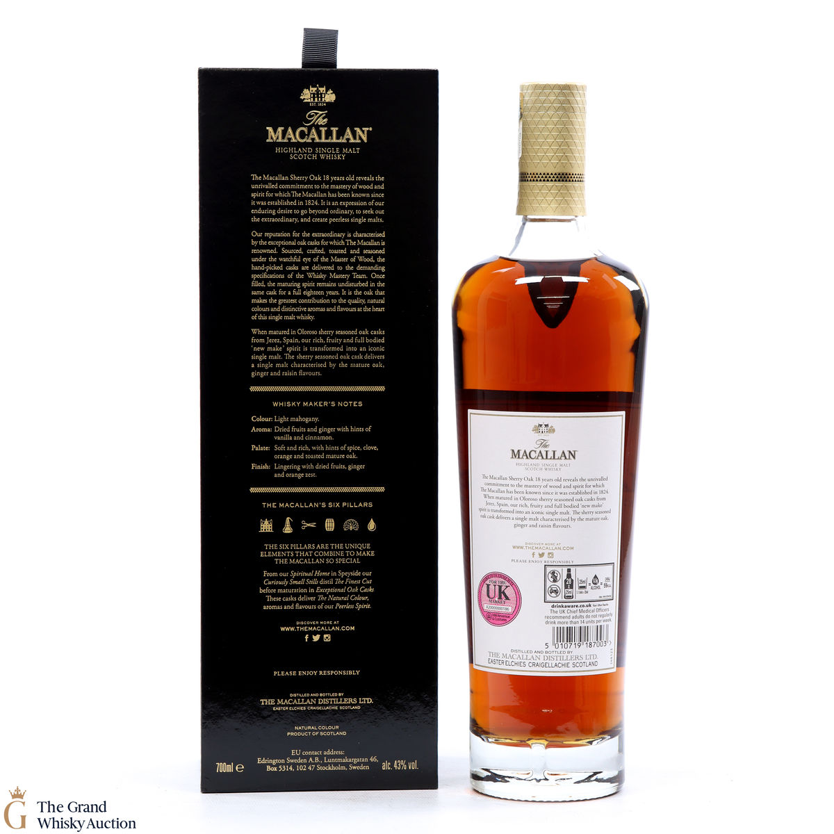This annual release of The Macallan's popular 18 Year Old Sherry Oak is matured exclusively in sherry seasoned casks, built from both Spanish and American oak, providing a beautifully dark flavour with rich aromas.
