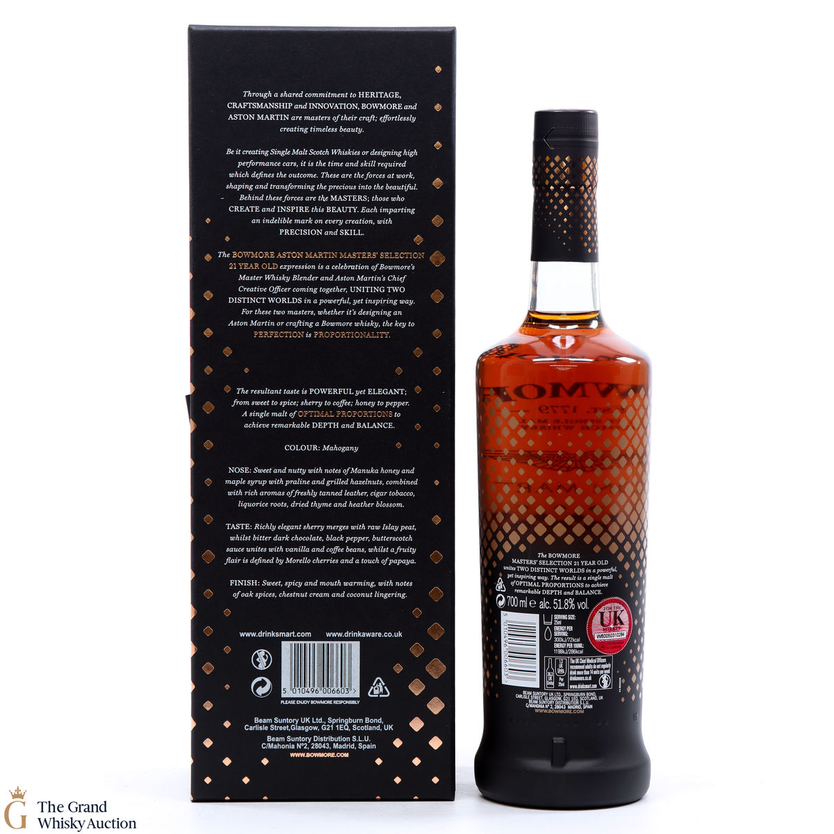 This 21-Year-Old Bowmore is a limited-edition single malt created in collaboration between Ron Welsh, Bowmore Master Blender and Marek Reichman, Aston Martin Chief Creative Officer. Matured in a combination of oloroso and Pedro Ximenez sherry casks. The result is a single malt that thrills all the senses for optimal enjoyment.