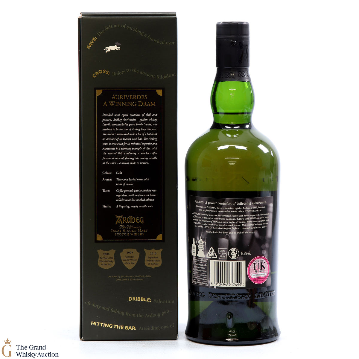 This special edition Ardbeg single malt was released on Ardbeg Day 2014. during Feis Ile. Auri(Gold) verdes (Green) it refers to the golden whisky and the iconic Ardbeg green bottle of Ardbeg whisky. It is said to be a dram of two halves - the whisky uses toasted cask lids to create Mocha Coffee flavours that team up with creamy vanilla.