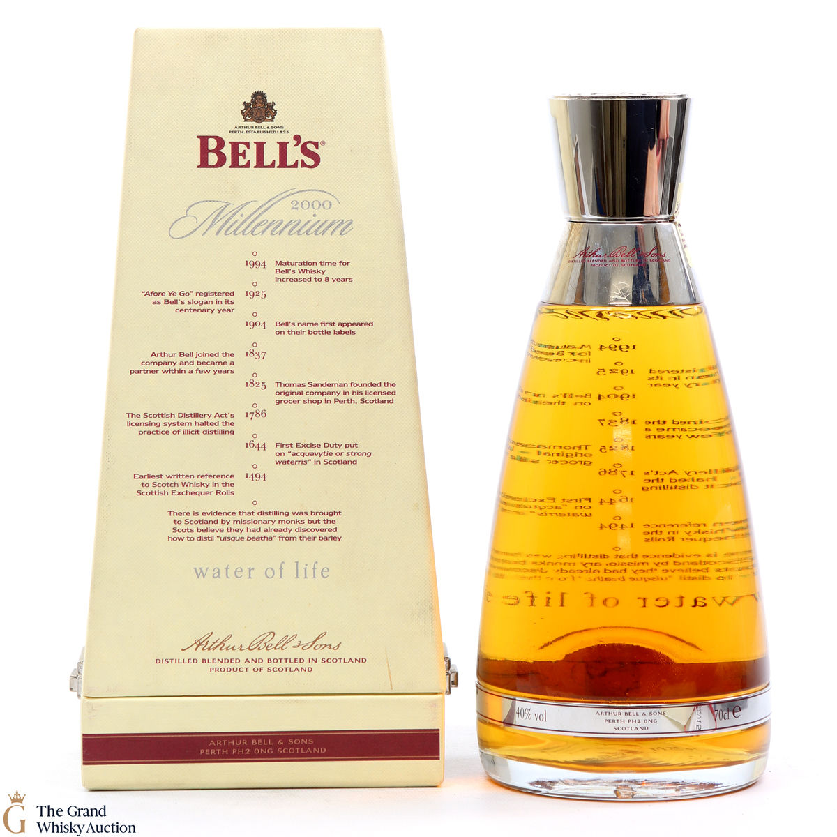 A special Millennium decanter of 8-year-old blended whisky from Bell's bottled for the Millennium in 2000 consisting of single malt and grain whiskies.