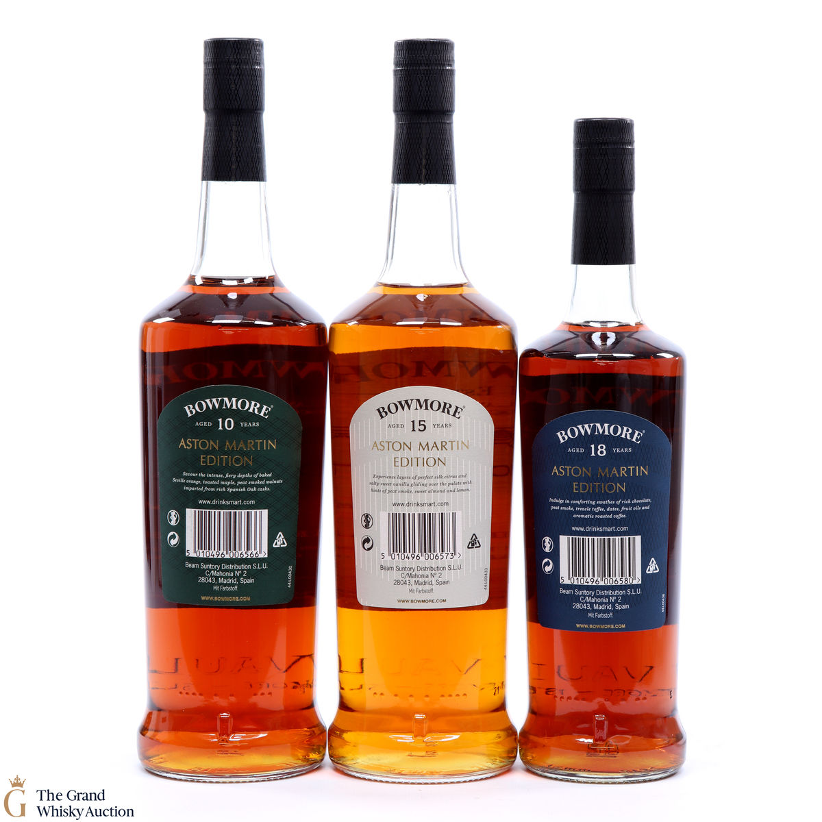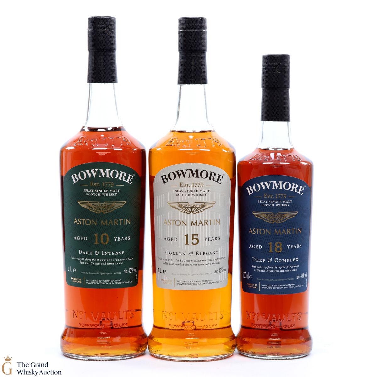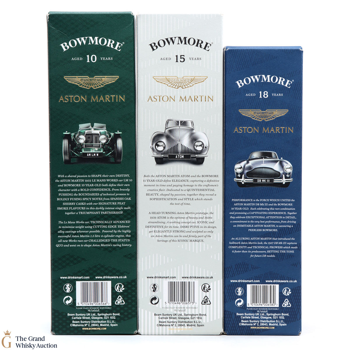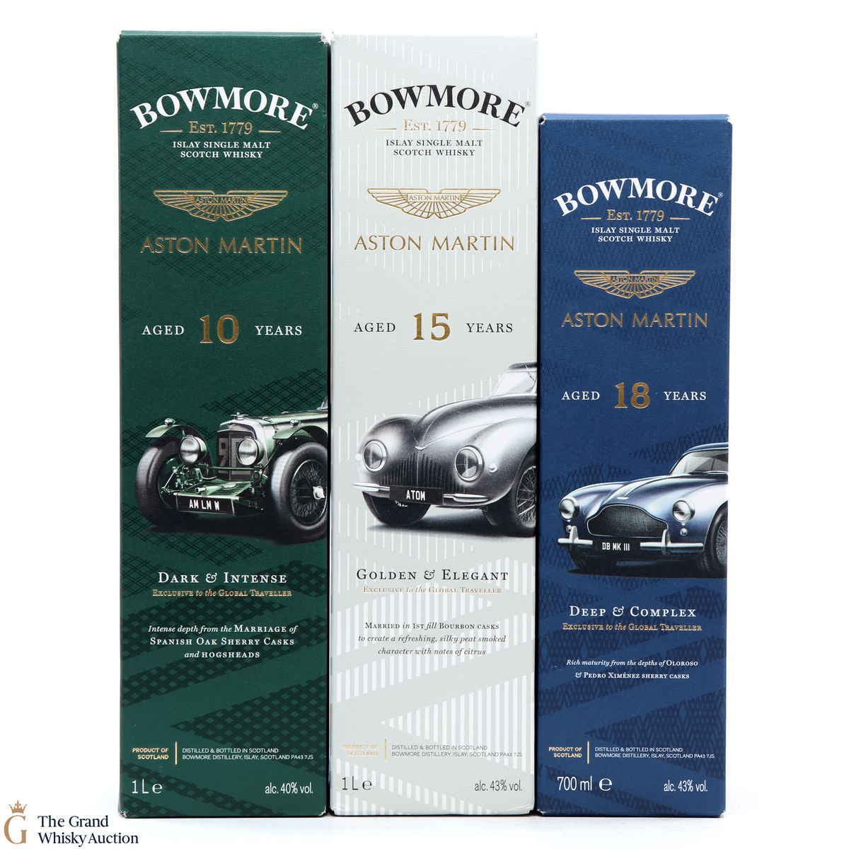 The full collection of the collaboration between Bowmore and Aston Martin, both creating timeless beauty and a lasting legacy. Each edition of the Aston Martin collection features a different car. Included in this lot is edition 1, 2 and 3: