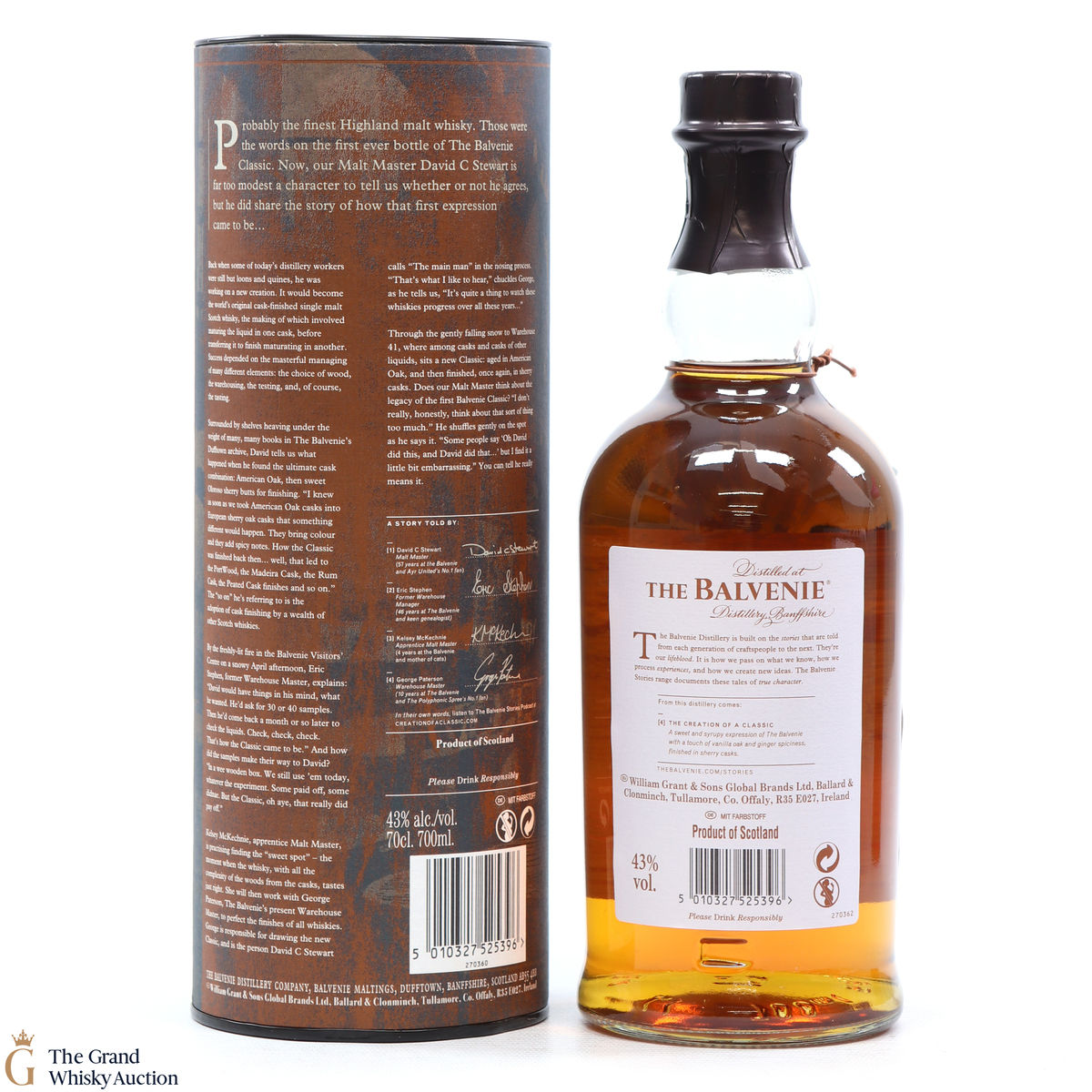 Part of a new trio of whiskies in The Balvenie Stories collection. This no-age-statement whisky pays homage to David Stewart MBE, The Balvenie malt master and longest-serving malt master in the industry. Stewart created the first cask-finished whisky back in the 1980s with The Balvenie Classic. The Creation of the Classic has been matured in American oak casks and finished in oloroso Sherry casks.