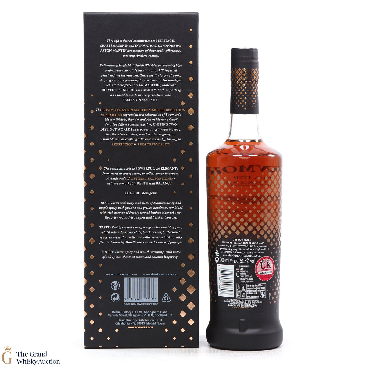 This 21-Year-Old Bowmore is a limited-edition single malt created in collaboration between Ron Welsh, Bowmore Master Blender and Marek Reichman, Aston Martin Chief Creative Officer. Matured in a combination of oloroso and Pedro Ximenez sherry casks. The result is a single malt that thrills all the senses for optimal enjoyment.