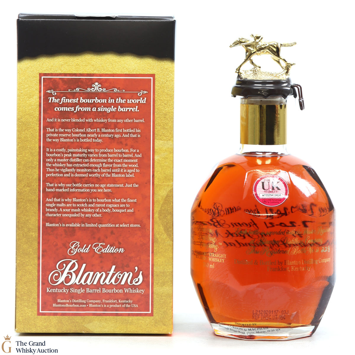 PLEASE NOTE: The wax seal on Blanton's bottles are prone to cracking in transit due to their design. Therefore, as stated in our T&C’s, we do not and will not accept liability should the seal be breached, broken, split or leak in transit. Additionally, please know due to the design of the internal cardboard packaging that surrounds the top of the bottles, it too may be torn. By bidding on this lot you have understood this to be true. Insurance is for complete breakage or loss in transit only.