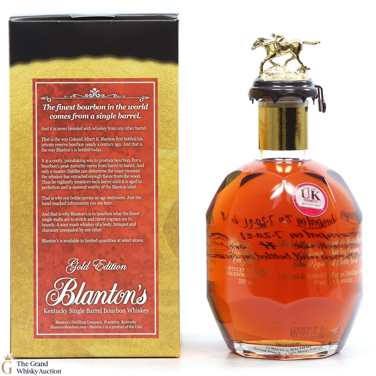 PLEASE NOTE: The wax seal on Blanton's bottles are prone to cracking in transit due to their design. Therefore, as stated in our T&C’s, we do not and will not accept liability should the seal be breached, broken, split or leak in transit. Additionally, please know due to the design of the internal cardboard packaging that surrounds the top of the bottles, it too may be torn. By bidding on this lot you have understood this to be true. Insurance is for complete breakage or loss in transit only.