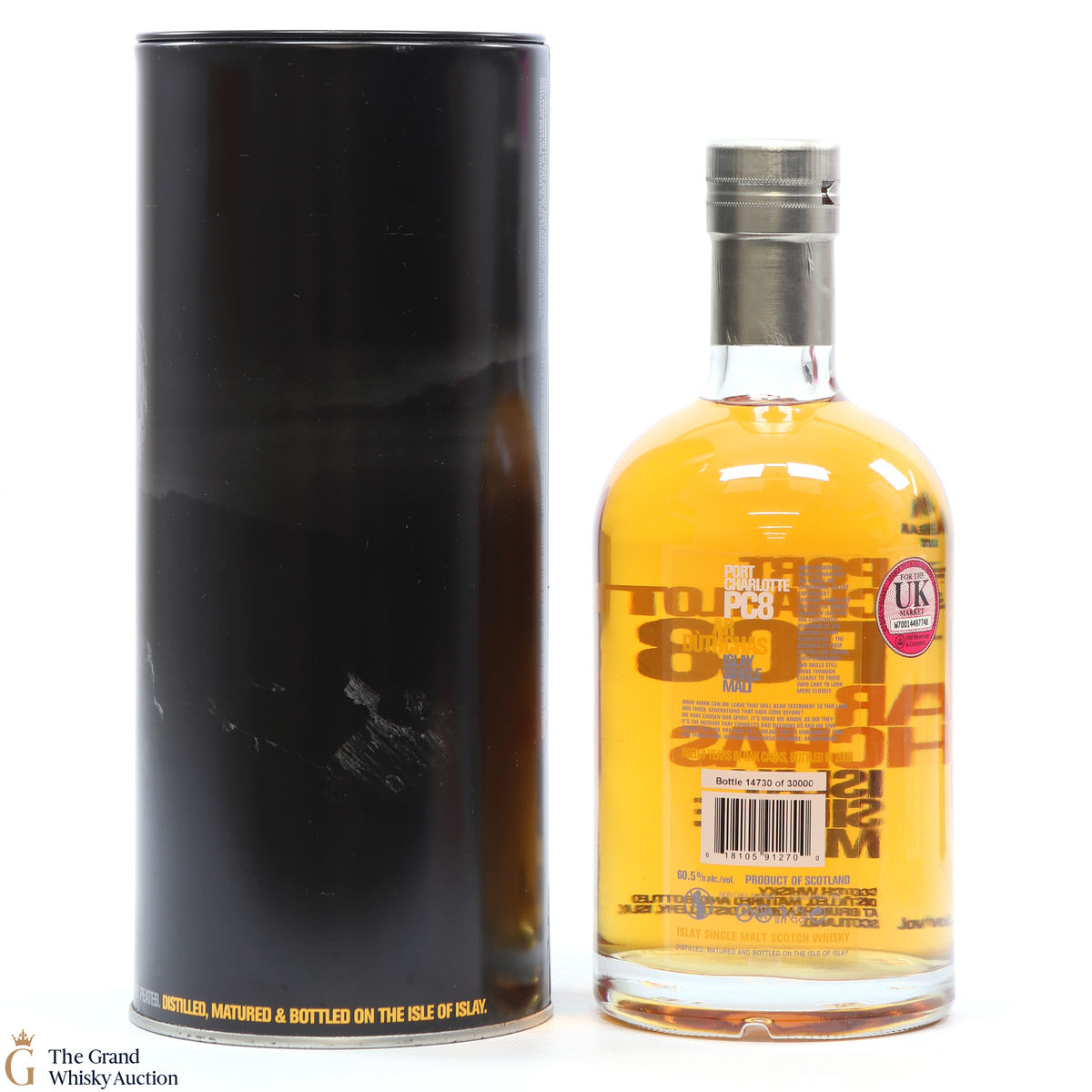 Port Charlotte PC8, produced by Bruichladdich Distillery, is a heavily peated spirit. It was the first release of heavily peated Port Charlotte and was produced in 2009 from some of the first spirits to be produced after the distillery's reopening. The single malt was bottled at 8 years old in 2006 and was limited to 30000 bottles.