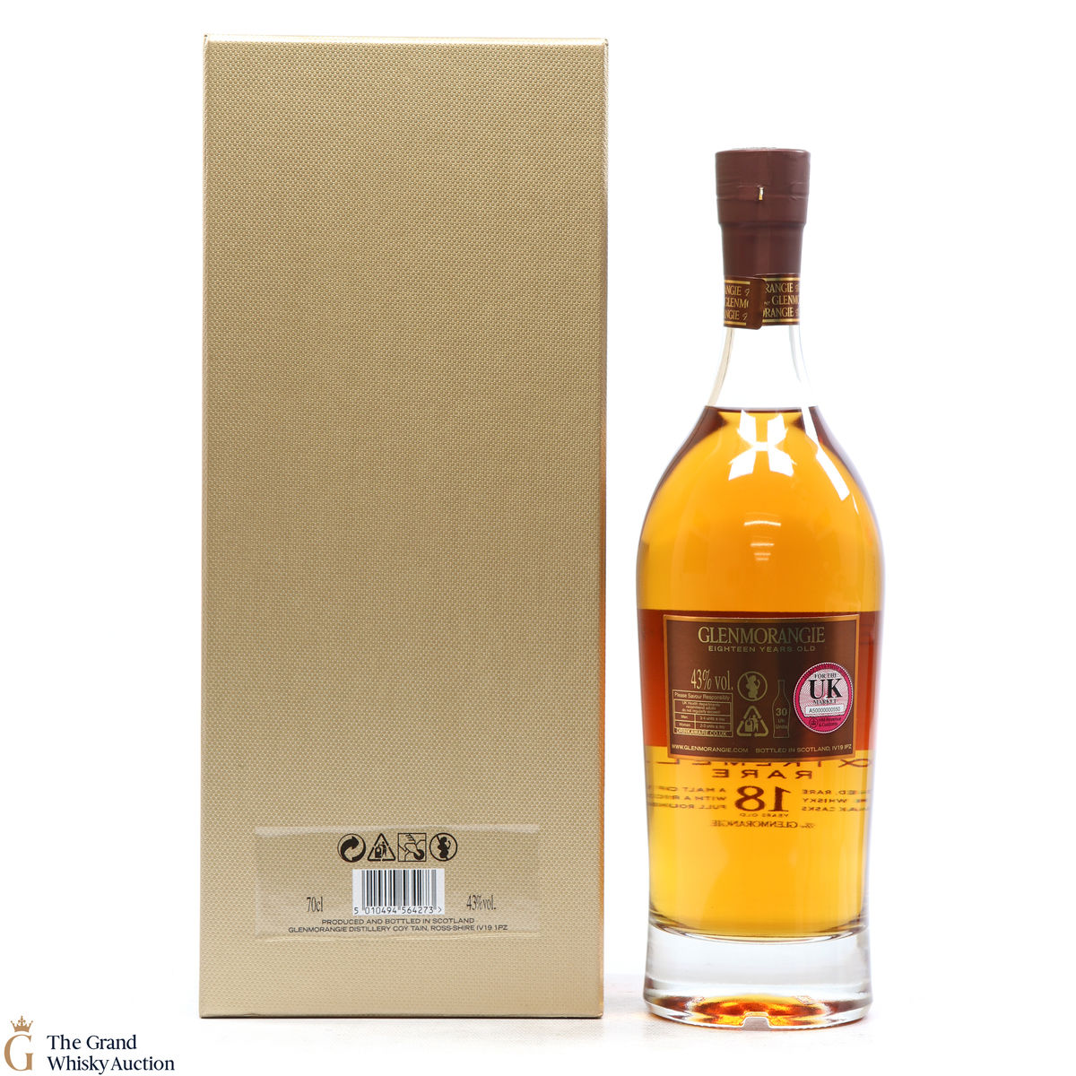 This bottle is an 18-year-old Extremely Rare, Highland single malt produced by Glenmorangie. It has been perfected by the sixteen men of Tain who have specially aged this bottle for 18 years in superior oak casks.