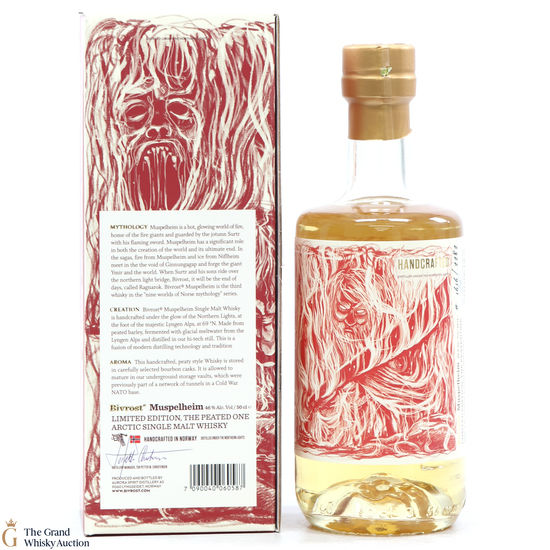 This is a limited edition bottle created in Arctic Norway was 'handcrafted under the Northern Lights'. This is a limited edition - The Peated One. Muspelheim is one of the Nine Worlds of Norse mythology - a hot and glowing land of fire, home to the fire giants and guarded by the jotunn Surtr with his flaming sword. This is a 50cl bottling.