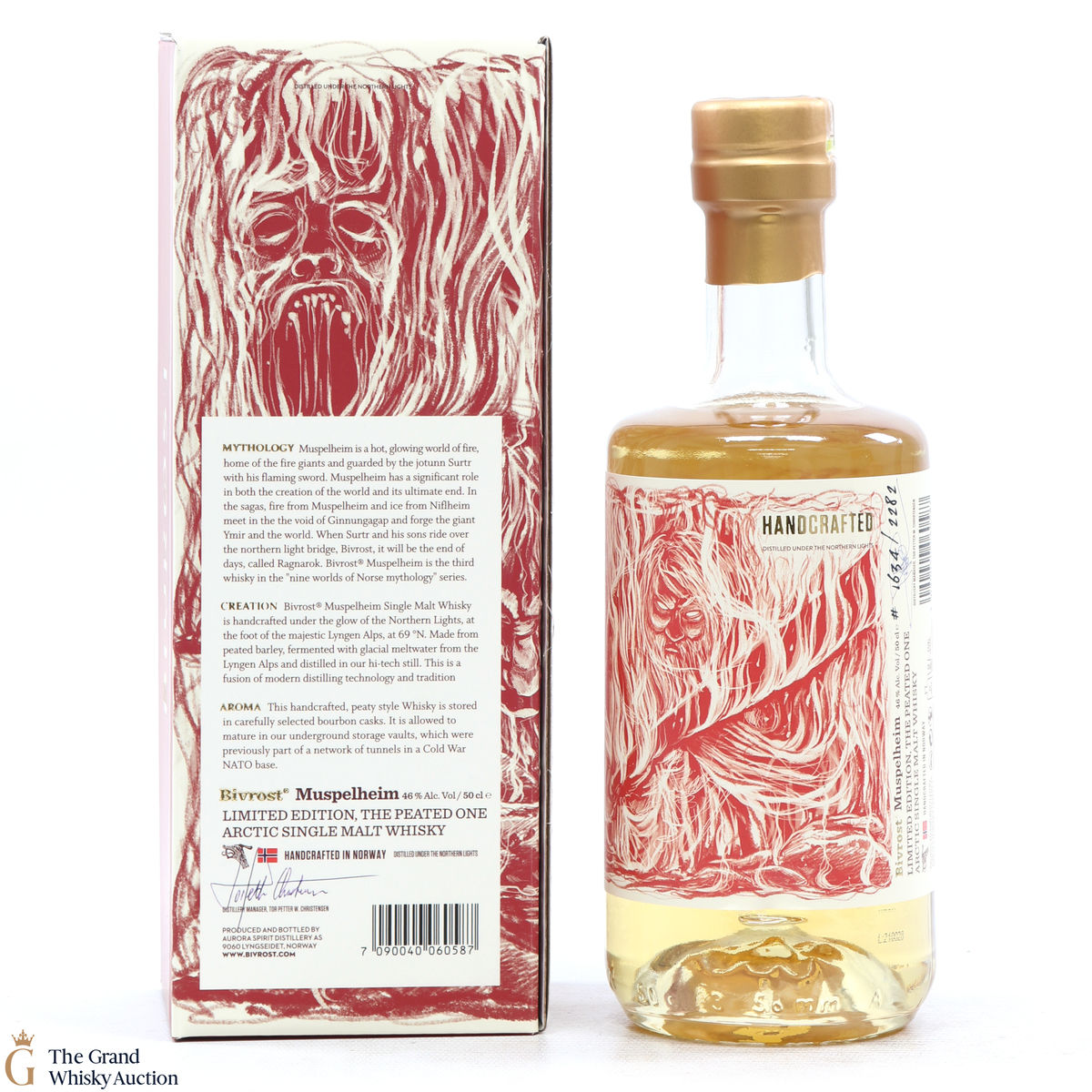 This is a limited edition bottle created in Arctic Norway was 'handcrafted under the Northern Lights'. This is a limited edition - The Peated One. Muspelheim is one of the Nine Worlds of Norse mythology - a hot and glowing land of fire, home to the fire giants and guarded by the jotunn Surtr with his flaming sword. This is a 50cl bottling.