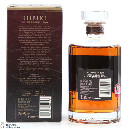 Hibiki 21 Year Old is a very popular blended whisky from Suntory. It is made up of a blend of specially selected mature malt and grain whiskies aged over 21 years. The key Yamazaki sherry casked malt is vatted with other carefully chosen mellow unblended grain whiskies over 21 years old.