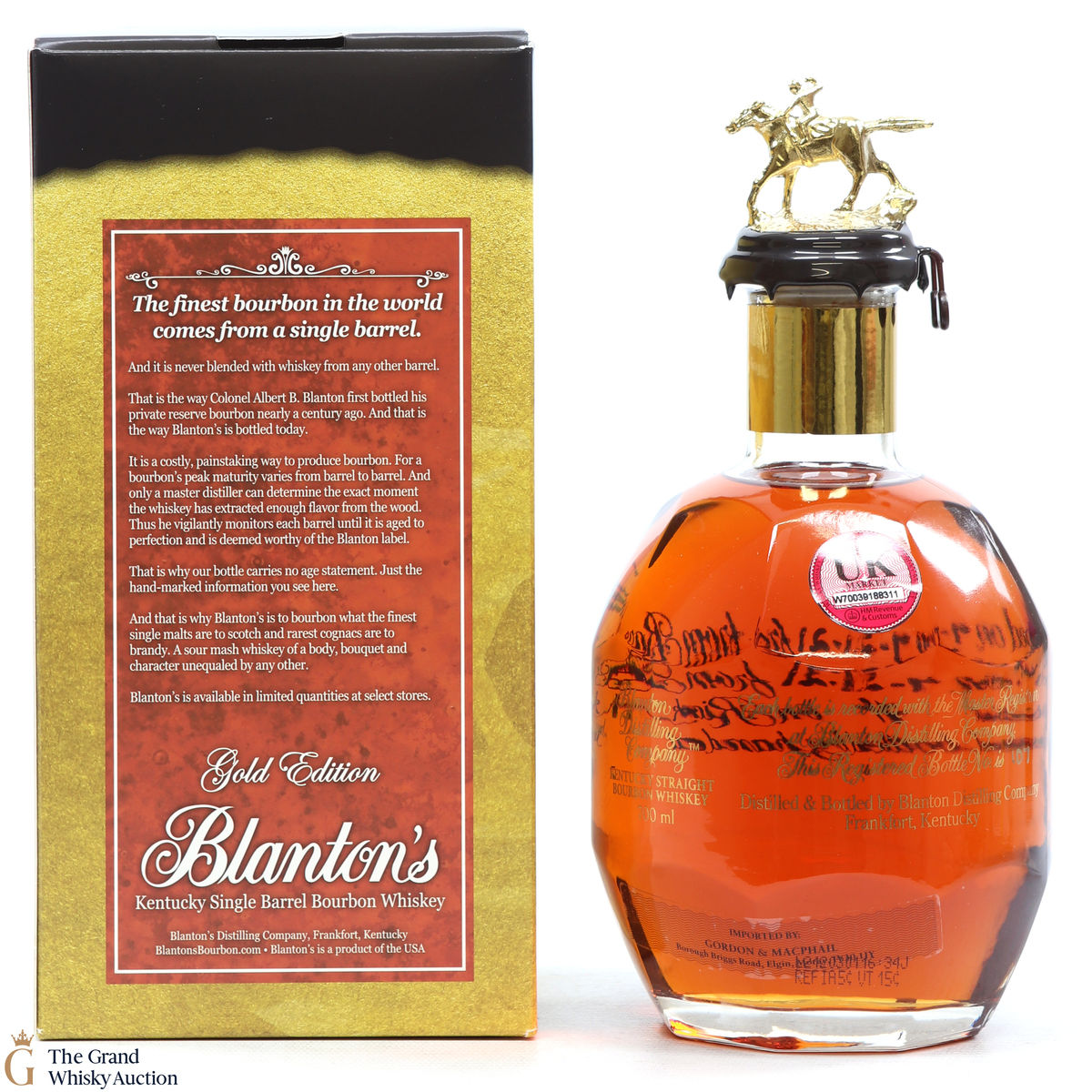 PLEASE NOTE: The wax seal on Blanton's bottles are prone to cracking in transit due to their design. Therefore, as stated in our T&C’s, we do not and will not accept liability should the seal be breached, broken, split or leak in transit. Additionally, please know due to the design of the internal cardboard packaging that surrounds the top of the bottles, it too may be torn. By bidding on this lot you have understood this to be true. Insurance is for complete breakage or loss in transit only.