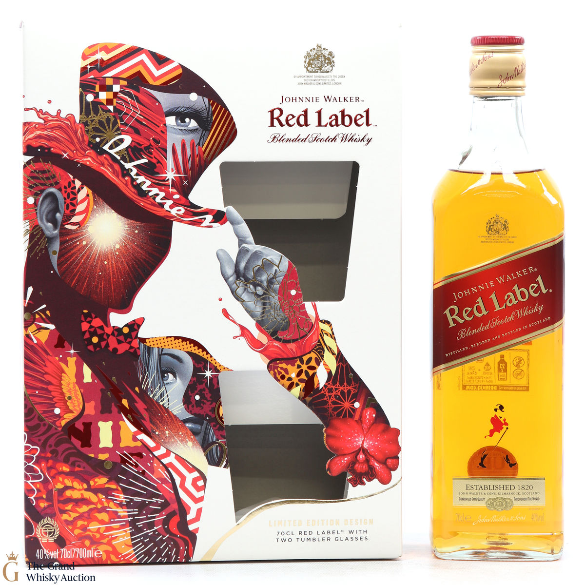 This limited edition gift set contains 1 x 70cl of Johnnie Walker - Red Label and 2 x tumbler glasses.
