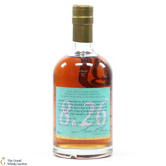 This rare Bruichladdich Islay Single Malt was bottled to mark the first anniversary of the reopening of Bruichladdich - the first spirit ran into the Spirit Safe at 8.26 am on the 29th of May, 2001.