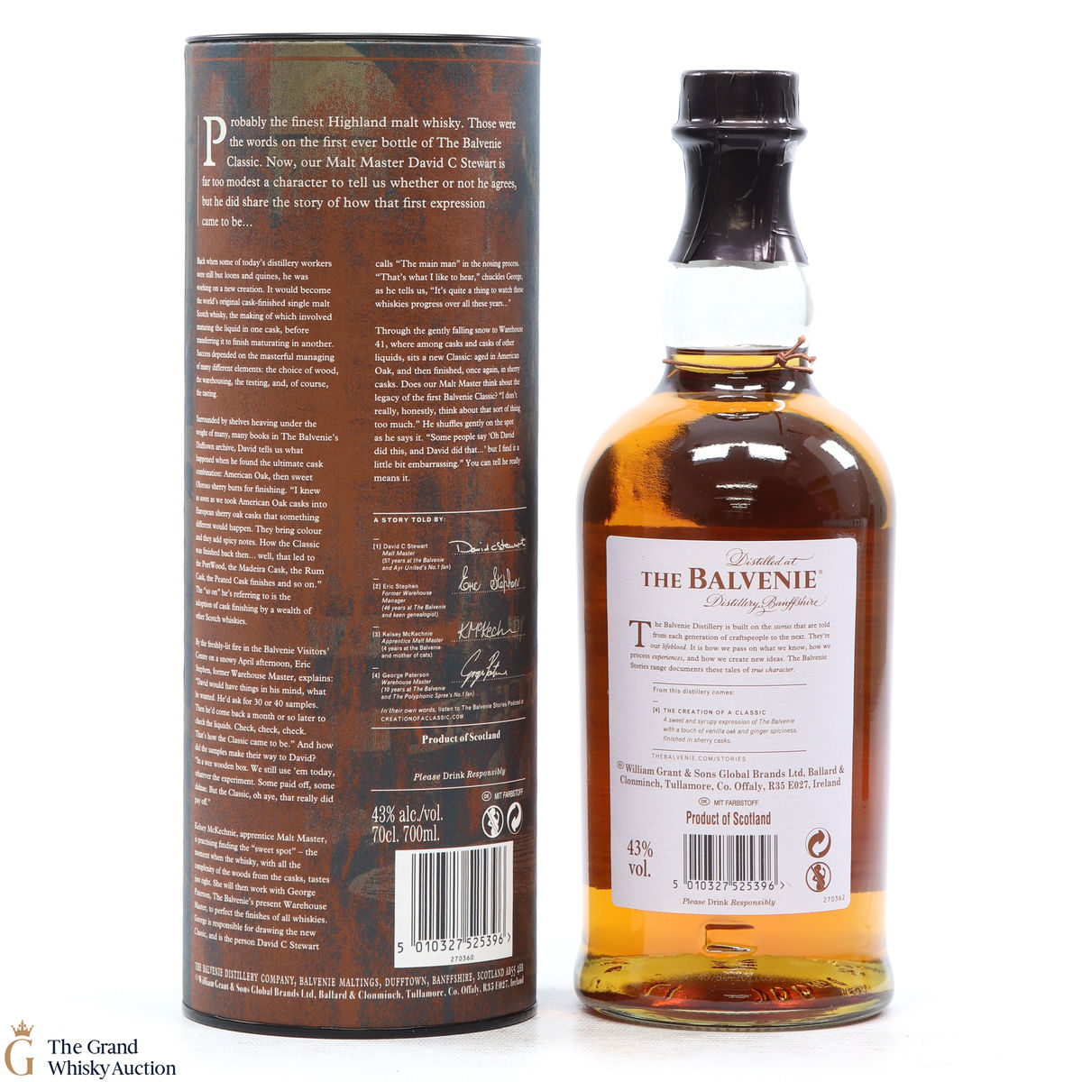 Part of a new trio of whiskies in The Balvenie Stories collection. This no-age-statement whisky pays homage to David Stewart MBE, The Balvenie malt master and longest-serving malt master in the industry. Stewart created the first cask-finished whisky back in the 1980s with The Balvenie Classic. The Creation of the Classic has been matured in American oak casks and finished in oloroso Sherry casks.
