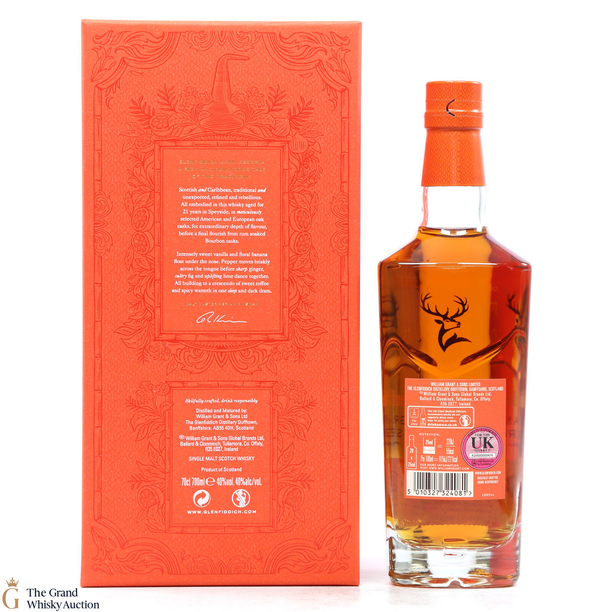 The Glenfiddich Gran Reserva has matured and mellowed in American Oak Casks for 21 years before been finished in previously used Caribbean Rum casks for 4 months.