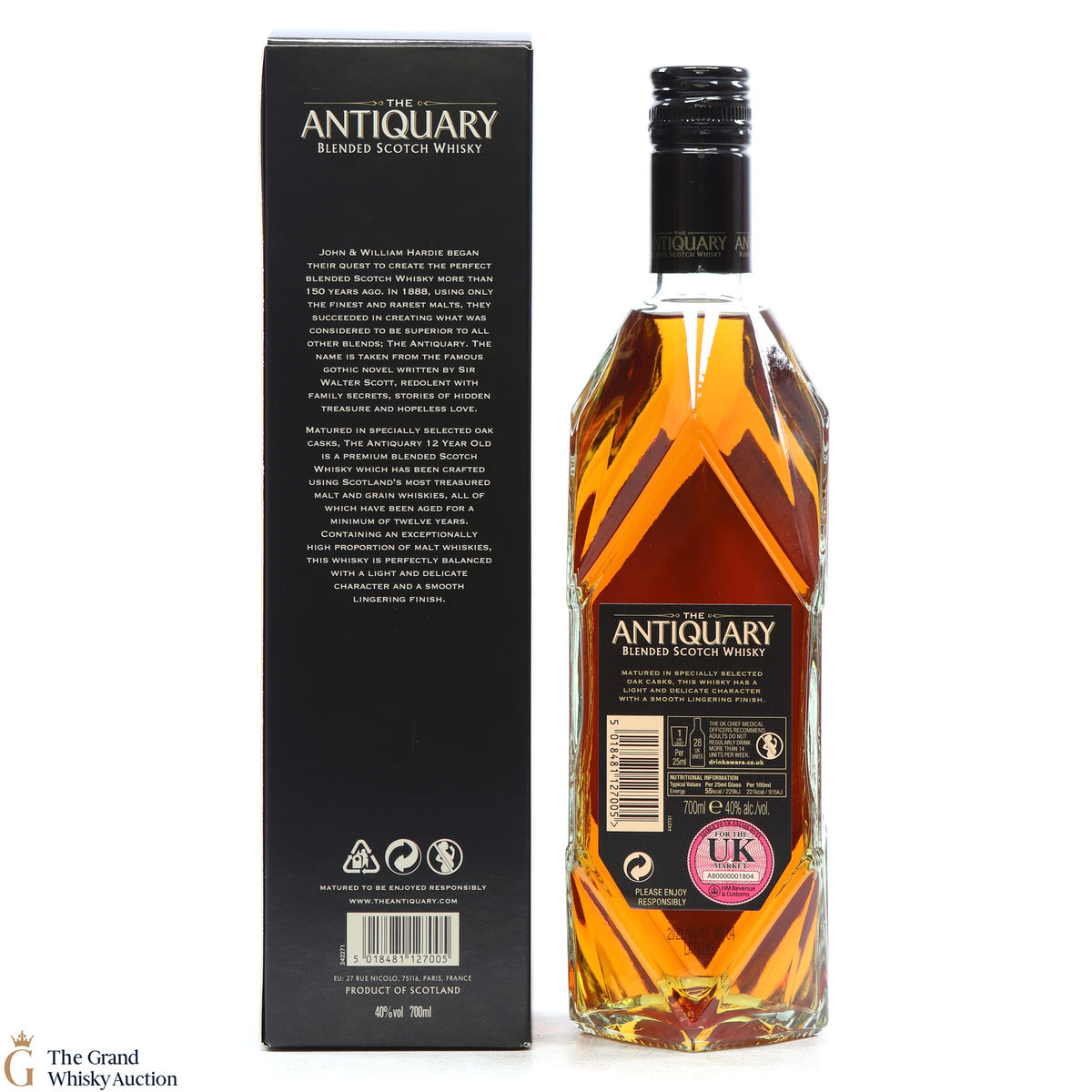 This bottling from Antiquary is a blend of some of Scotland's greatest 12-year-old malt and grain whiskies, including Royal Lochnagar, Tomatin, Cragganmore, Mortlach, Bowmore, Glenkinchie to name a few. Also, a quirky feature is that In the lid of this bottle box, there is a coaster that pops out!