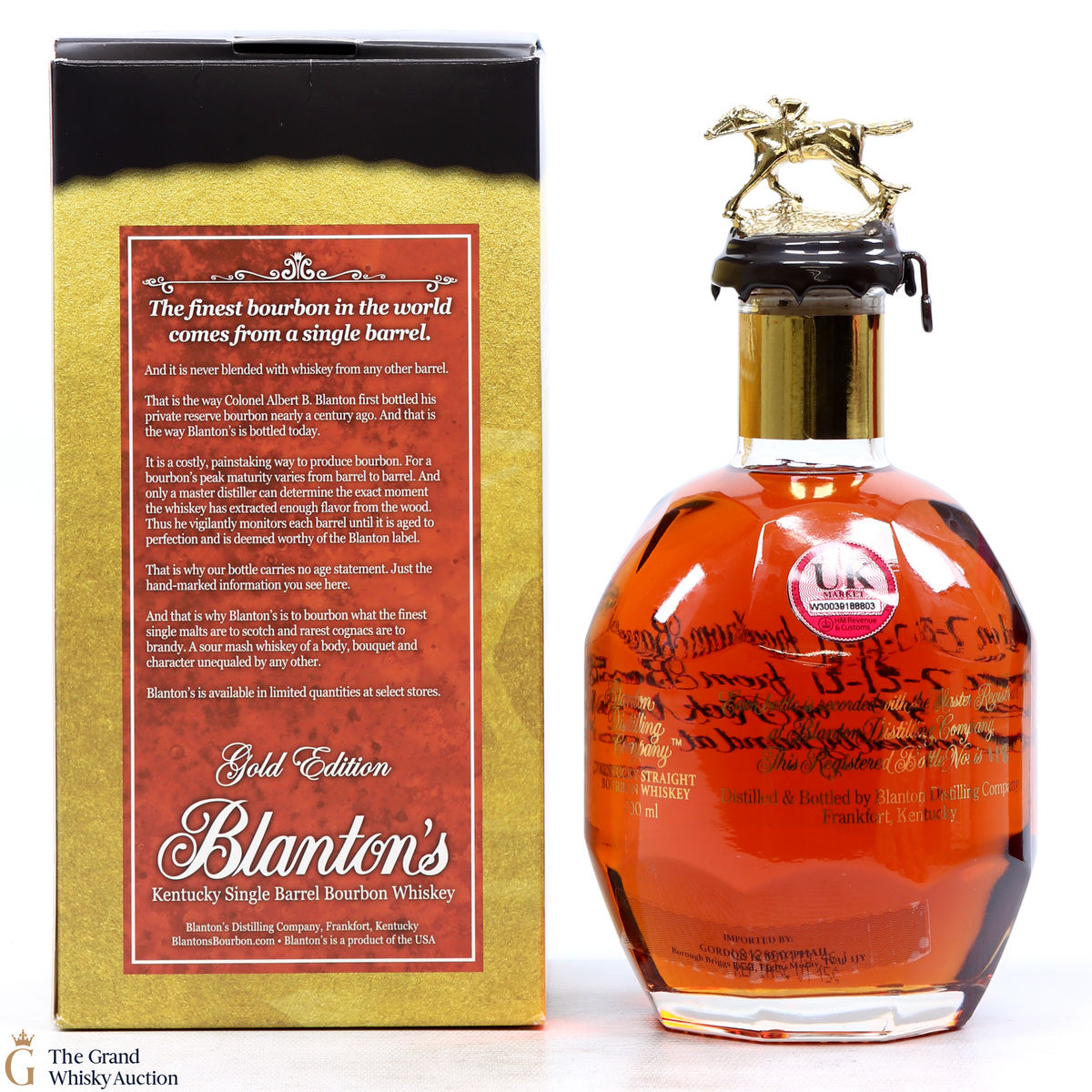 PLEASE NOTE: The wax seal on Blanton's bottles are prone to cracking in transit due to their design. Therefore, as stated in our T&C’s, we do not and will not accept liability should the seal be breached, broken, split or leak in transit. Additionally, please know due to the design of the internal cardboard packaging that surrounds the top of the bottles, it too may be torn. By bidding on this lot you have understood this to be true. Insurance is for complete breakage or loss in transit only.