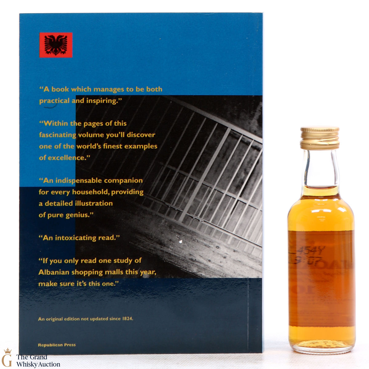 This is a 10-year-old Macallan 5cl miniature bottle hidden inside the pages of this paperback book - A Study of Albanian Shopping Malls.