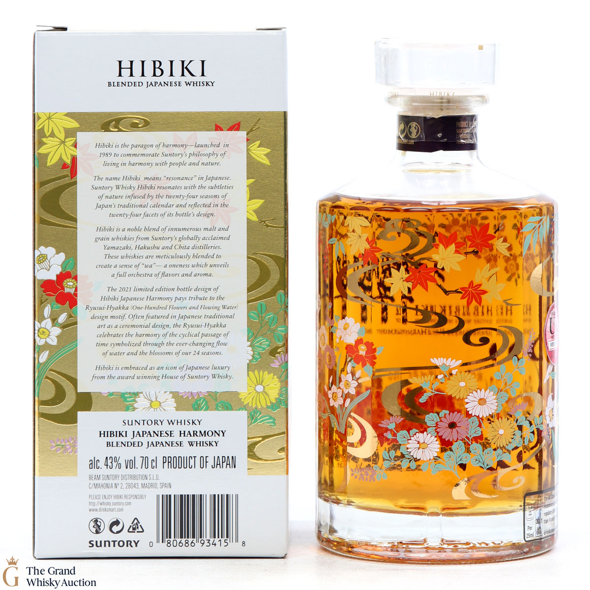 This is a limited edition, specially designed bottle with painted flowers and flowing ribbons of water. The 2021 special edition pays homage to the Ryisui-Hyakka (One Hundred Flowers and Flowing Water) and celebrates different seasonal flowers which help characterise the Japanese seasons. 5 types of casks were used and in typical Hibiki fashion, the bottle always has 24 facets which represent 24 seasons in the Japanese lunar calendar.